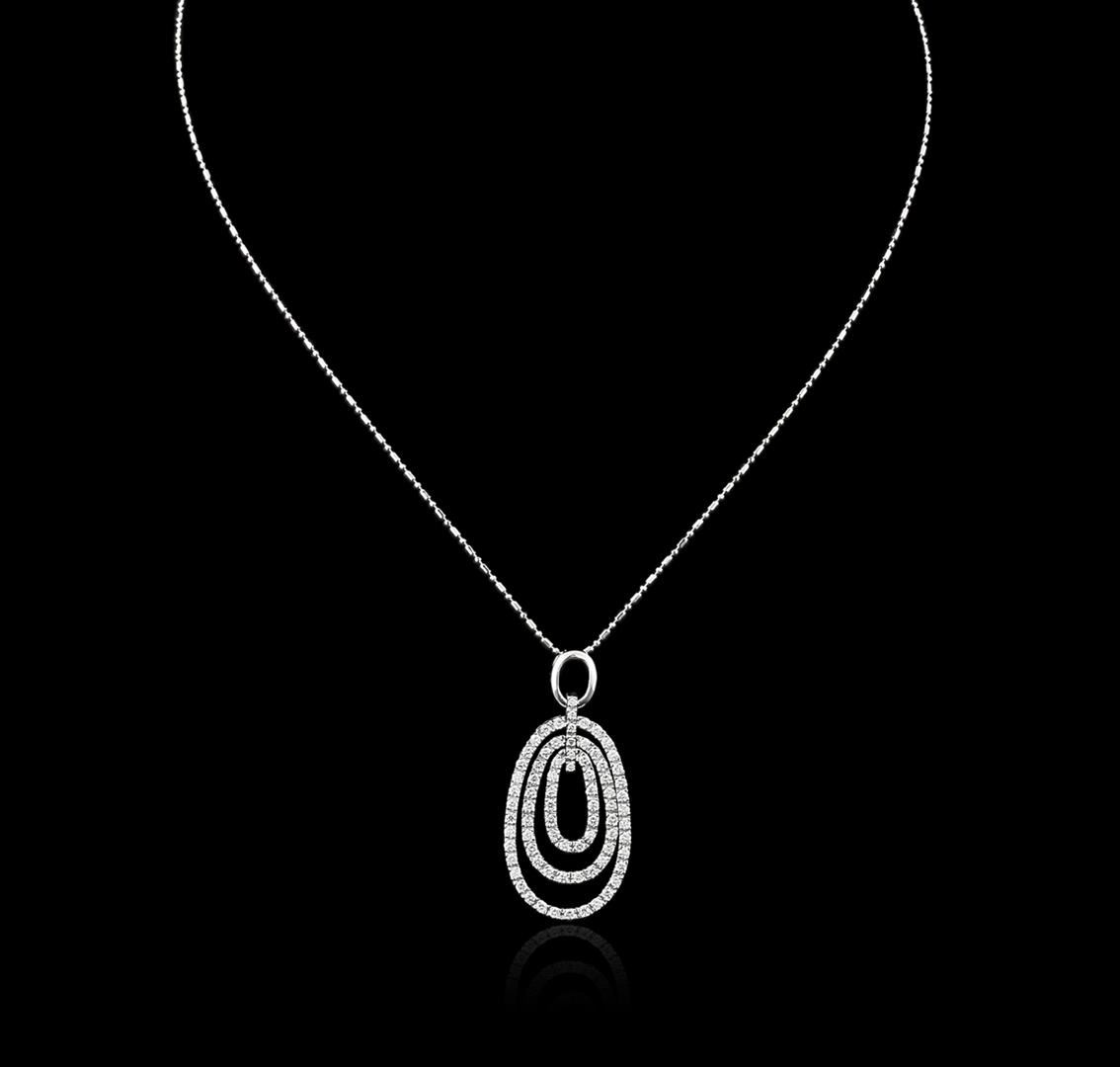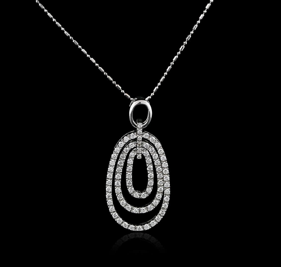 One electronically tested 14KT white gold ladies cast diamond pendant & chain 18.0" long, with a spring ring clasp with a bright polish finish. Identified with markings of "14K". Condition is new. Containing: Seventy-Eight prong set round brilliant cut diamonds, measuring 1.50 - 1.30 x 0.84mm (depth est.) approximate total weight of 78 Stones = 1.30ct. Clarity: SI-1 to SI-2. Color: G - H, Cut is Good. All diamonds are graded in the mounting, unless otherwise stated. Total Weight of Diamonds 1.30ct. Total Weight of Pendant & Chain 8.90 grams. GGL Appraised at $4,210.00.