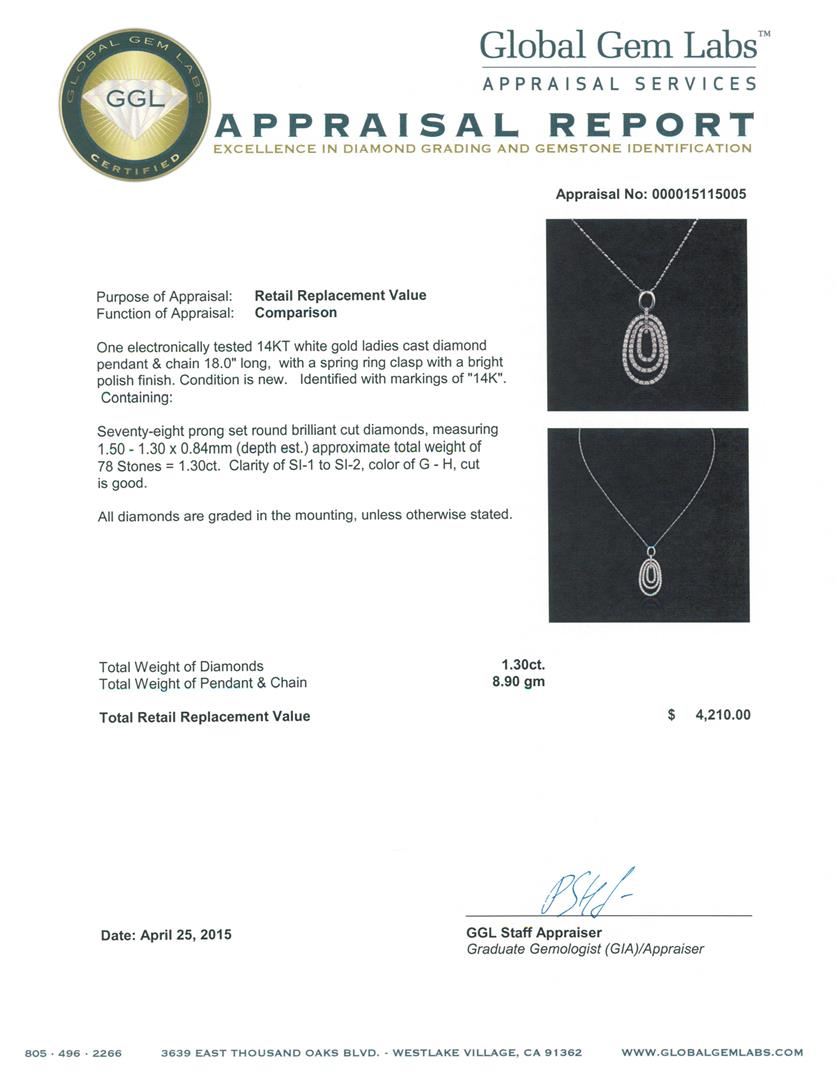 One electronically tested 14KT white gold ladies cast diamond pendant & chain 18.0" long, with a spring ring clasp with a bright polish finish. Identified with markings of "14K". Condition is new. Containing: Seventy-Eight prong set round brilliant cut diamonds, measuring 1.50 - 1.30 x 0.84mm (depth est.) approximate total weight of 78 Stones = 1.30ct. Clarity: SI-1 to SI-2. Color: G - H, Cut is Good. All diamonds are graded in the mounting, unless otherwise stated. Total Weight of Diamonds 1.30ct. Total Weight of Pendant & Chain 8.90 grams. GGL Appraised at $4,210.00.