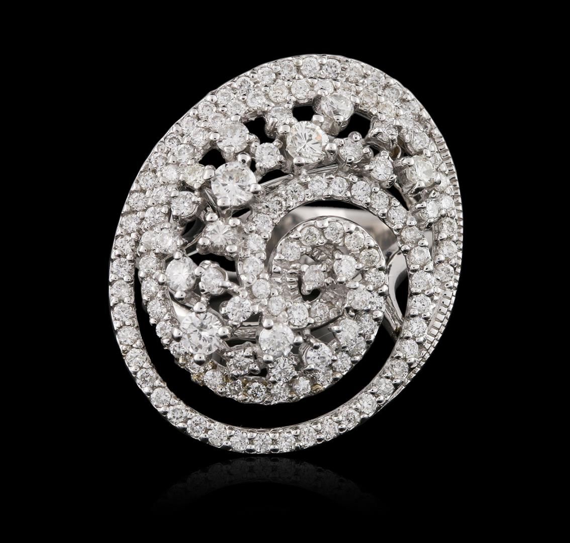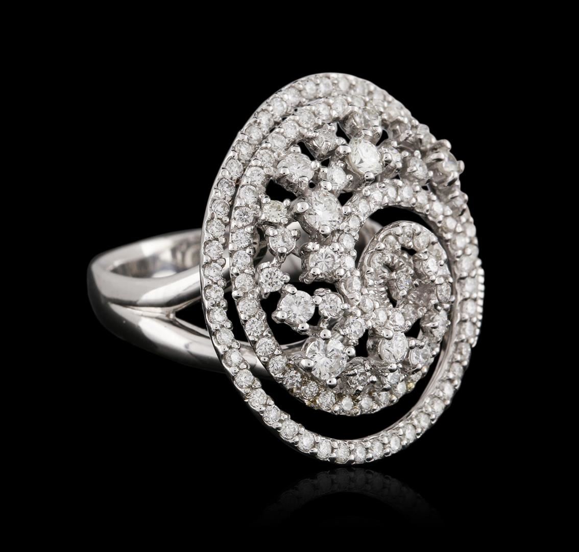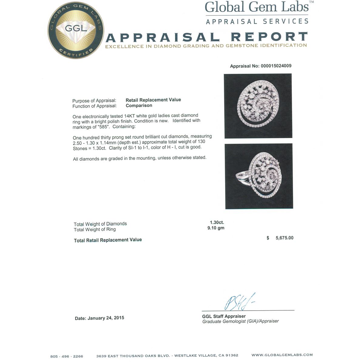 One electronically tested 14KT white gold ladies cast diamond ring with a bright polish finish. Identified with markings of "585". Condition is new. Containing: One Hundred Thirty prong set round brilliant cut diamonds, measuring 2.50 - 1.30 x 1.14mm (depth est.) approximate total weight of 130 Stones = 1.30ct. Clarity: SI-1 to I-1. Color: H - I, Cut is Good. All diamonds are graded in the mounting, unless otherwise stated. Total Weight of Diamonds 1.30ct. Total Weight of Ring 9.10 grams. GGL Appraised at $5,675.00.