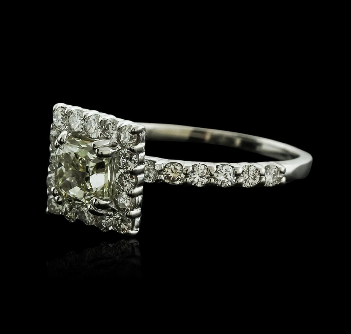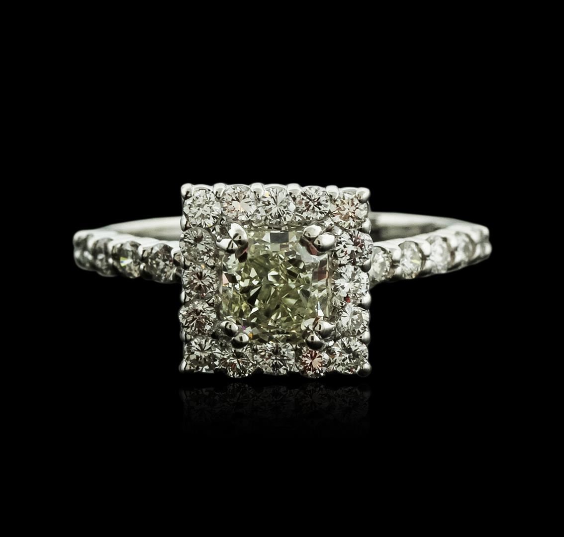 One electronically tested 14KT white gold ladies combination cast & assembled diamond engagement ring with a flat shank with a bright polish finish. Identified with markings of "14K". Condition is new. Containing: One prong set radiant shaped cut diamond, measuring 5.40 x 5.09 x 3.16mm (depth est.) approximate weight of 0.71ct. Clarity: VS-2, Cut is Good. Twenty-Eight prong set round brilliant cut diamonds, measuring 1.80 - 1.80 x 1.08mm (depth est.) approximate total weight of 28 Stones = 0.60ct. Clarity: SI-1 to SI-2. Color: H - I, Cut is Good. All diamonds are graded in the mounting, unless otherwise stated. Total Weight of Diamonds 1.31ct. Total Weight of Engagement Ring 2.90 grams. GGL Appraised at $5,280.00.
