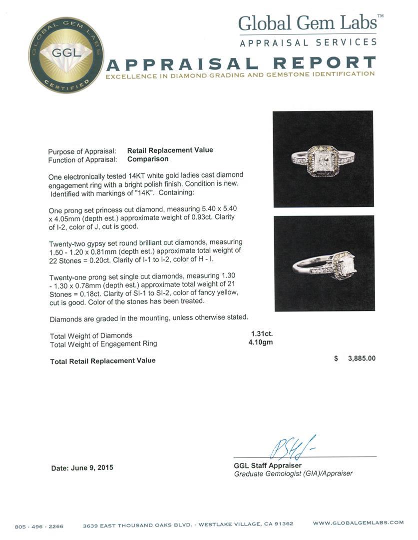 One electronically tested 14KT white gold ladies cast diamond ring with a bright polish finish. Identified with markings of "14K". Condition is new. Containing: One prong set princess cut diamond, measuring 5.40 x 5.40 x 4.05mm (depth est.) approximate weight of 0.93ct. Clarity: I-2. Color: J, Cut is Good. Twenty-Two gypsy set round brilliant cut diamonds, measuring 1.50 - 1.20 x 0.81mm (depth est.) approximate total weight of 22 Stones = 0.20ct. Clarity: I-1 to I-2. Color: H - I. Twenty-One prong set single cut diamonds, measuring 1.30 - 1.30 x 0.78mm (depth est.) approximate total weight of 21 Stones = 0.18ct. Clarity: SI-1 to SI-2, Cut is Good. Color of the stones has been treated. Diamonds are graded in the mounting, unless otherwise stated. Total Weight of Diamonds 1.31ct. Total Weight of Ring 4.10 grams. GGL Appraised at $3,885.00.
