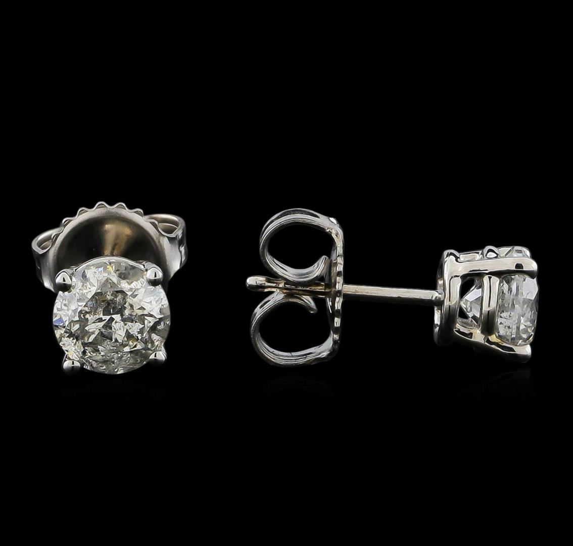 One pair electronically tested 14KT white gold ladies cast stud earrings with friction posts with a bright polish finish. Identified with markings of "14K". Condition is new. Containing: One prong set round brilliant cut diamond, measuring 5.65 - 5.62 x 3.38mm (depth est.) approximate weight of 0.66ct. Clarity: I-3. Color: I, Cut is Good. One prong set round brilliant cut diamond, measuring 5.64 - 5.60 x 3.38mm (depth est.) approximate weight of 0.65ct. Clarity: I-3. Color: I, Cut is Good. All diamonds are graded in the mounting, unless otherwise stated total weight of Diamonds 1.31ct. Total Weight of Earrings 1.60 grams. GGL Appraised at $4,655.00.