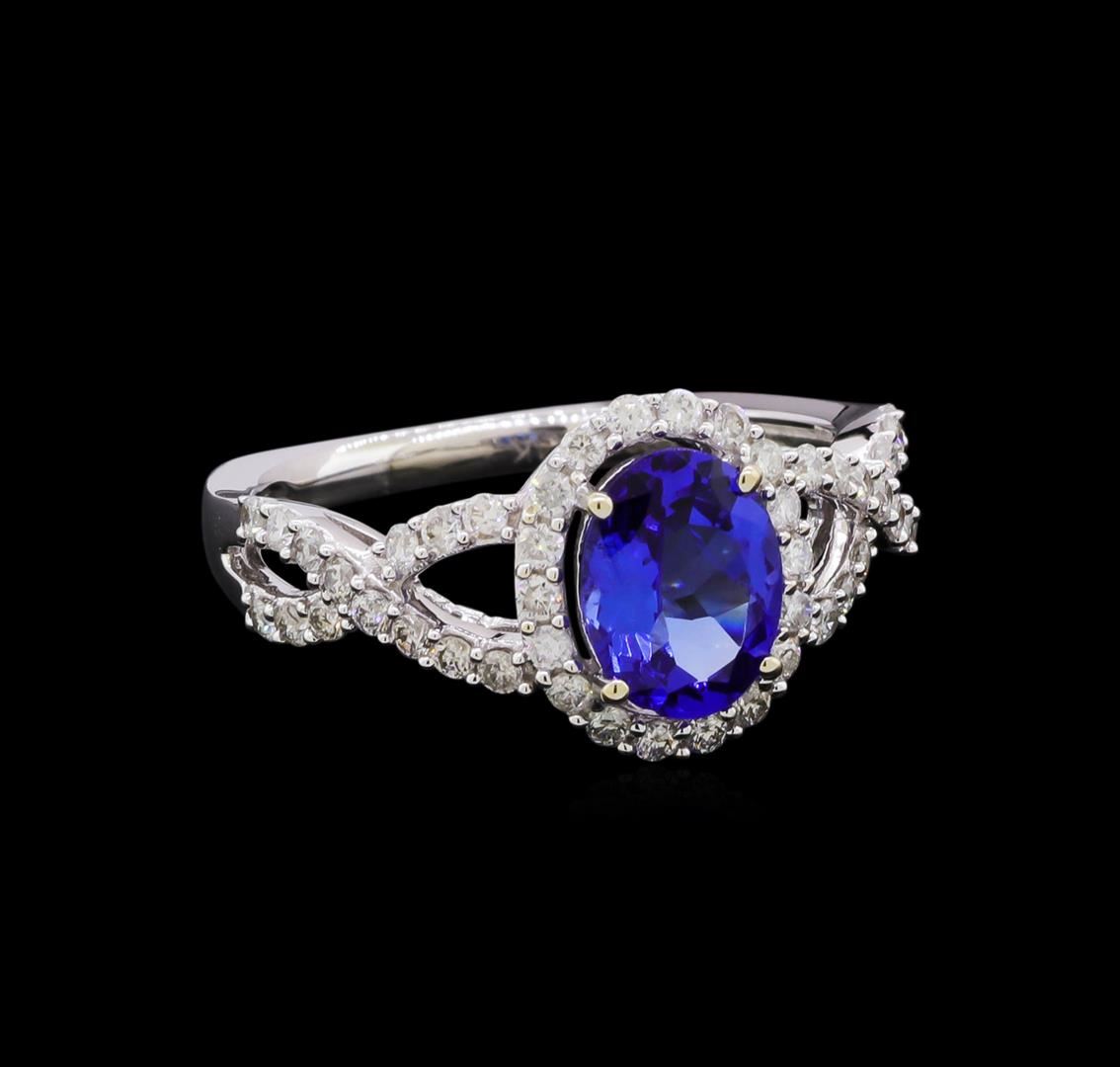 One electronically tested 14KT white gold ladies cast tanzanite and diamond ring with a bright polish finish. The featured tanzanite is set within a diamond bezel supported by intertwining diamond set shoulders, completed by a two millimeter wide band. Trademark is Orianne. Identified with markings of "14K". Condition is new, good workmanship. Containing: One prong set oval mixed cut natural tanzanite, measuring 8.10 x 6.10 x 3.65mm, 6% bulge factor, approximate weight of 1.31ct., clarity is eye clean, type I, medium dark, very slightly grayish, violetish blue color, (GIA vB 6/3), cut is good. Transmitting light with no distortion, transparent. Graded in the setting. Tanzanite is a very rare gemstone that is only found in the country of Tanzania. Originally discovered in 1967. Tiffany & Company, named the stone Tanzanite. It is found in the Usumburu Mountains that border the Umba Valley of northern Tanzania. Tanzanite occurs in gray, brown, violet, blue, reddish-purple, & green. The gem is interesting because of its exceptional pleochroism. Rotated in different directions a tanzanite will exhibit multiple changes of color. Tanzanite has a low tolerance to ultrasonic cleaning, and should not be cleaned using this method. Forty-Six prong set round brilliant cut diamonds, measuring 1.30 - 1.20 x 0.75mm (depth est.) approximate total weight of 46 Stones = 0.42ct. Graded in the setting. Clarity: I-1 to I-2. Color: G - I. Total Weight of Colored Stones 1.31ct. Total Weight of Diamonds 0.42ct. Total Weight of Ring 3.42 grams. AIG Appraised at $4,310.00.