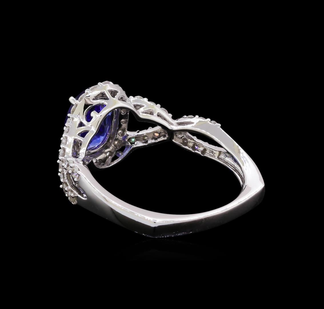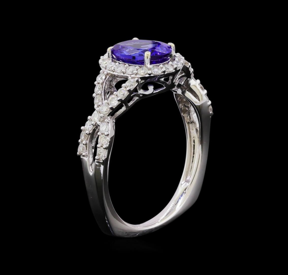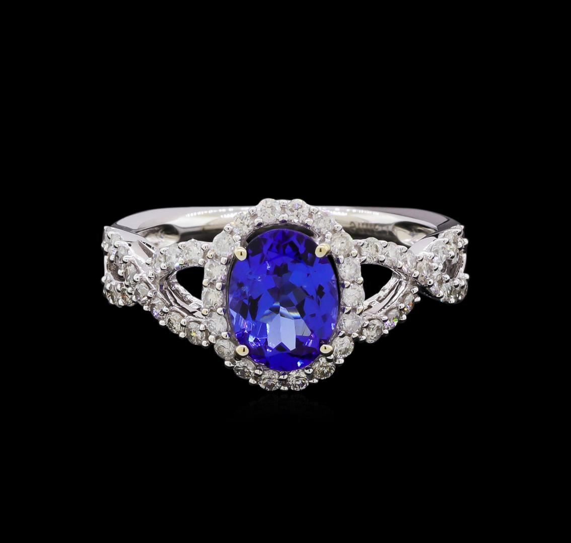 One electronically tested 14KT white gold ladies cast tanzanite and diamond ring with a bright polish finish. The featured tanzanite is set within a diamond bezel supported by intertwining diamond set shoulders, completed by a two millimeter wide band. Trademark is Orianne. Identified with markings of "14K". Condition is new, good workmanship. Containing: One prong set oval mixed cut natural tanzanite, measuring 8.10 x 6.10 x 3.65mm, 6% bulge factor, approximate weight of 1.31ct., clarity is eye clean, type I, medium dark, very slightly grayish, violetish blue color, (GIA vB 6/3), cut is good. Transmitting light with no distortion, transparent. Graded in the setting. Tanzanite is a very rare gemstone that is only found in the country of Tanzania. Originally discovered in 1967. Tiffany & Company, named the stone Tanzanite. It is found in the Usumburu Mountains that border the Umba Valley of northern Tanzania. Tanzanite occurs in gray, brown, violet, blue, reddish-purple, & green. The gem is interesting because of its exceptional pleochroism. Rotated in different directions a tanzanite will exhibit multiple changes of color. Tanzanite has a low tolerance to ultrasonic cleaning, and should not be cleaned using this method. Forty-Six prong set round brilliant cut diamonds, measuring 1.30 - 1.20 x 0.75mm (depth est.) approximate total weight of 46 Stones = 0.42ct. Graded in the setting. Clarity: I-1 to I-2. Color: G - I. Total Weight of Colored Stones 1.31ct. Total Weight of Diamonds 0.42ct. Total Weight of Ring 3.42 grams. AIG Appraised at $4,310.00.