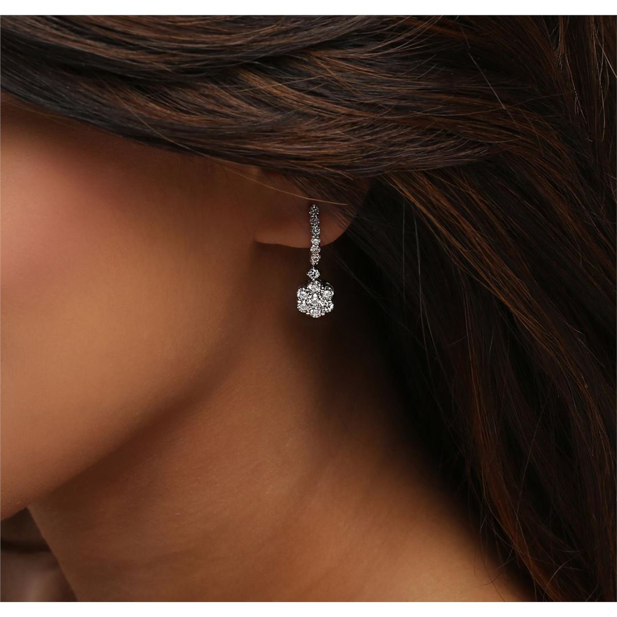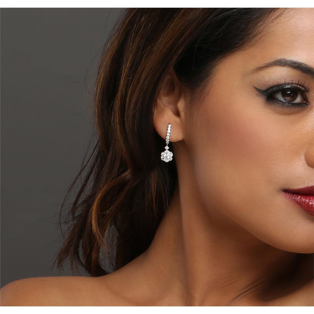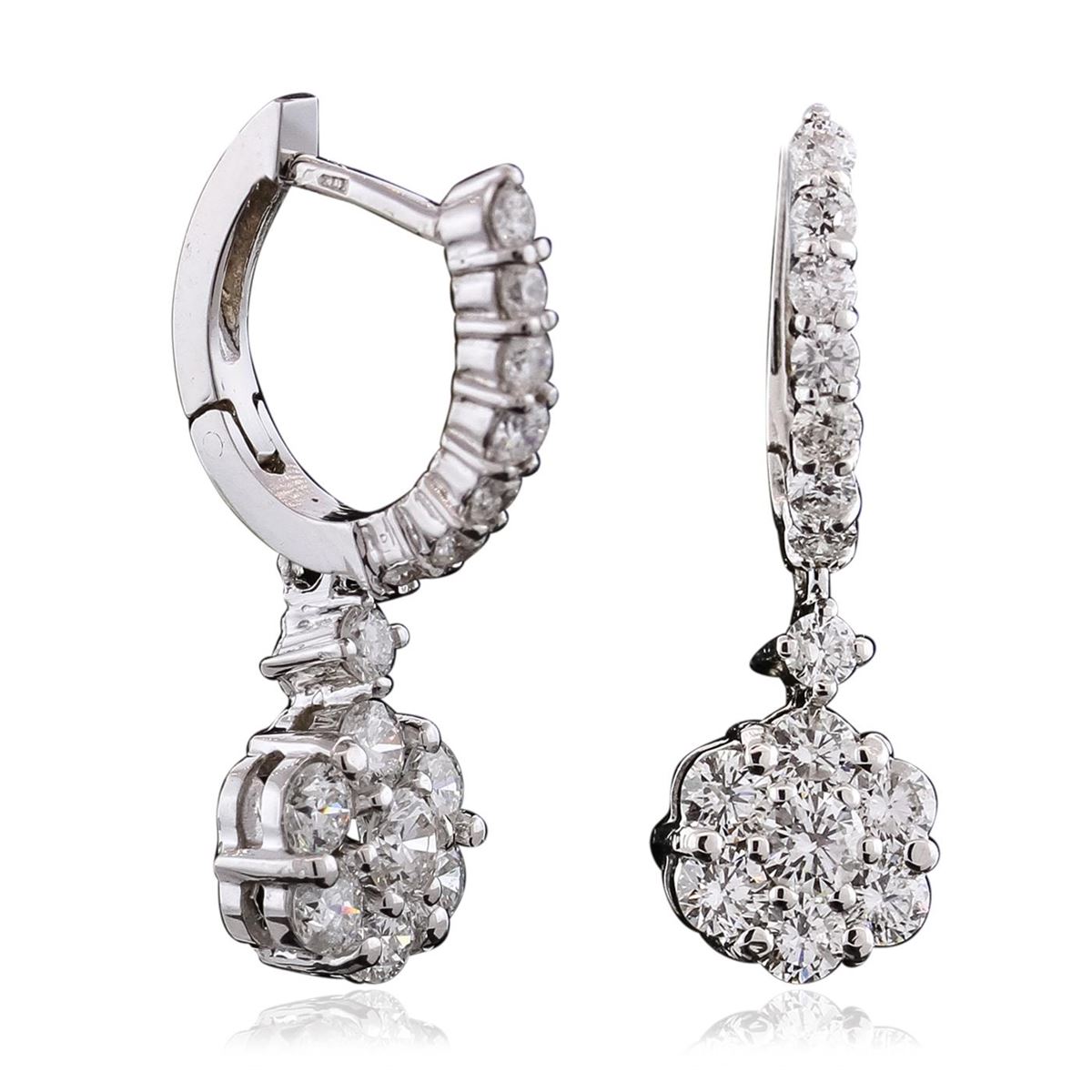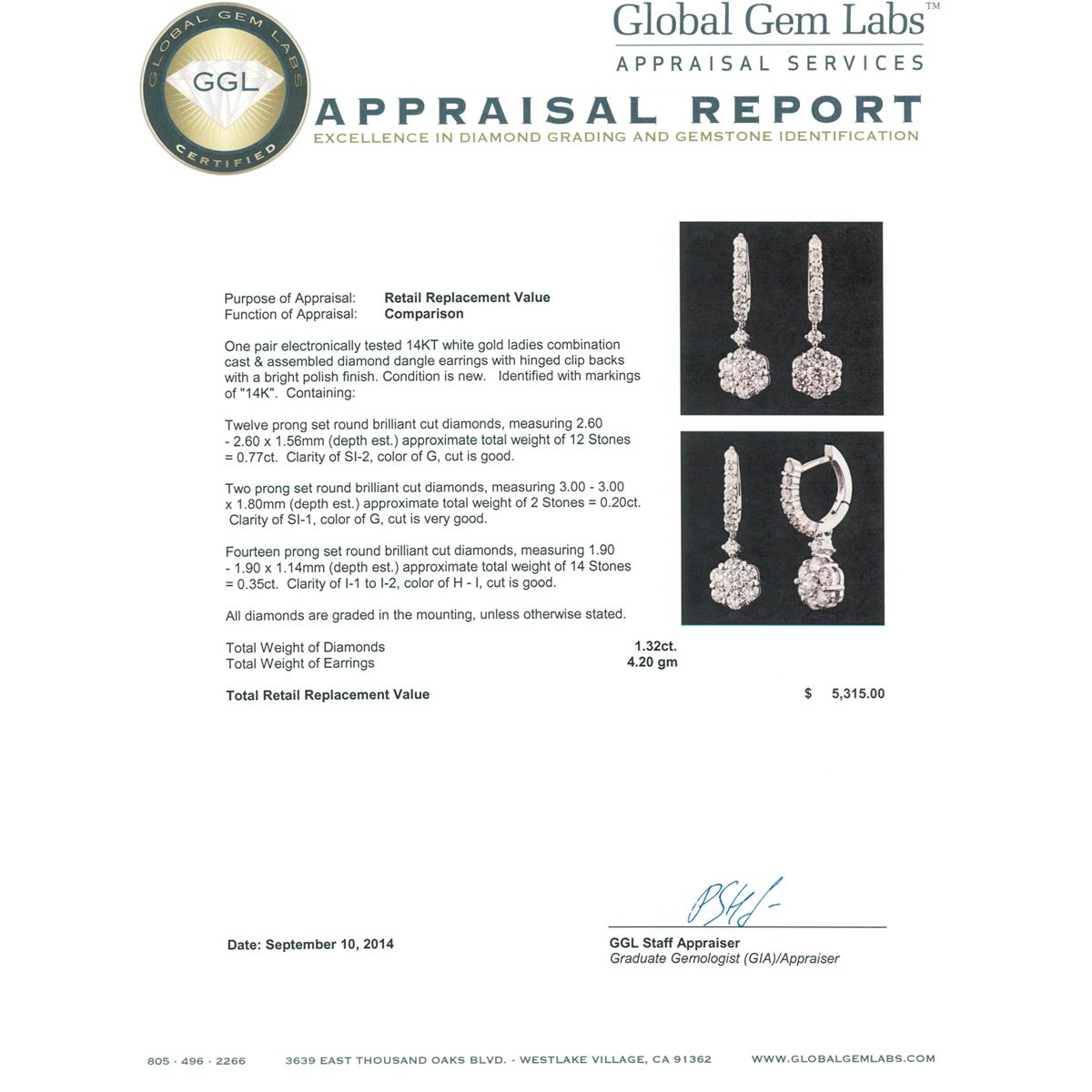 One pair electronically tested 14KT white gold ladies combination cast & assembled diamond dangle earrings with hinged clip backs with a bright polish finish. Identified with markings of "14K". Condition is new. Containing: Twelve prong set round brilliant cut diamonds, measuring 2.60 - 2.60 x 1.56mm (depth est.) approximate total weight of 12 Stones = 0.77ct. Clarity: SI-2. Color: G, Cut is Good. Two prong set round brilliant cut diamonds, measuring 3.00 - 3.00 x 1.80mm (depth est.) approximate total weight of 2 Stones = 0.20ct. Clarity: SI-1. Color: G, Cut is Very Good. Fourteen prong set round brilliant cut diamonds, measuring 1.90 - 1.90 x 1.14mm (depth est.) approximate total weight of 14 Stones = 0.35ct. Clarity: I-1 to I-2. Color: H - I, Cut is Good. All diamonds are graded in the mounting, unless otherwise stated. Total Weight of Diamonds 1.32ct. Total Weight of Earrings 4.20 grams. GGL Appraised at $5,315.00.