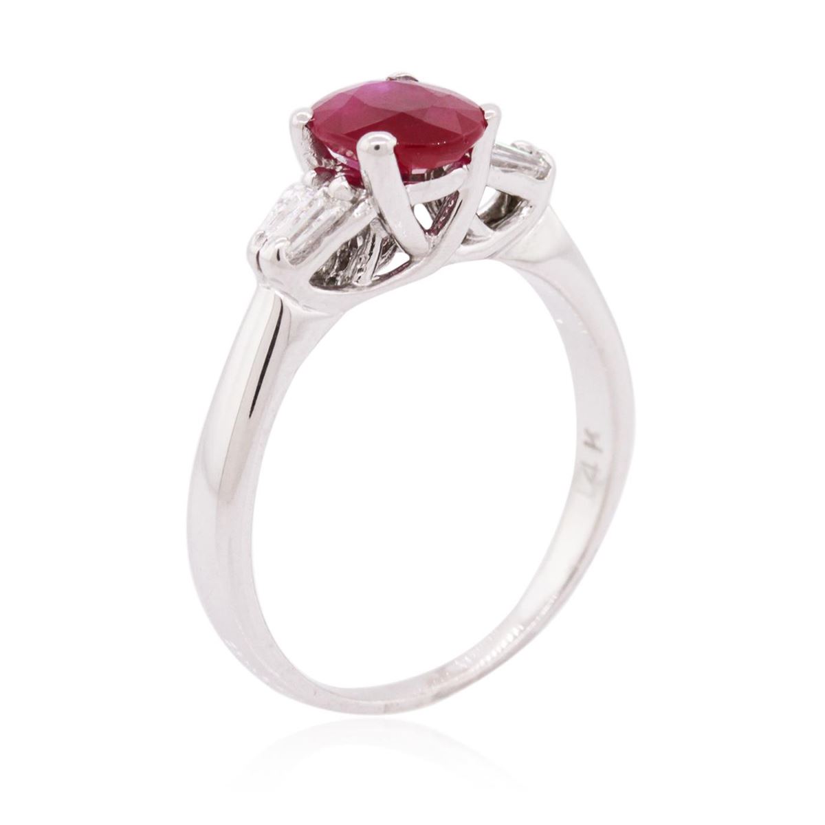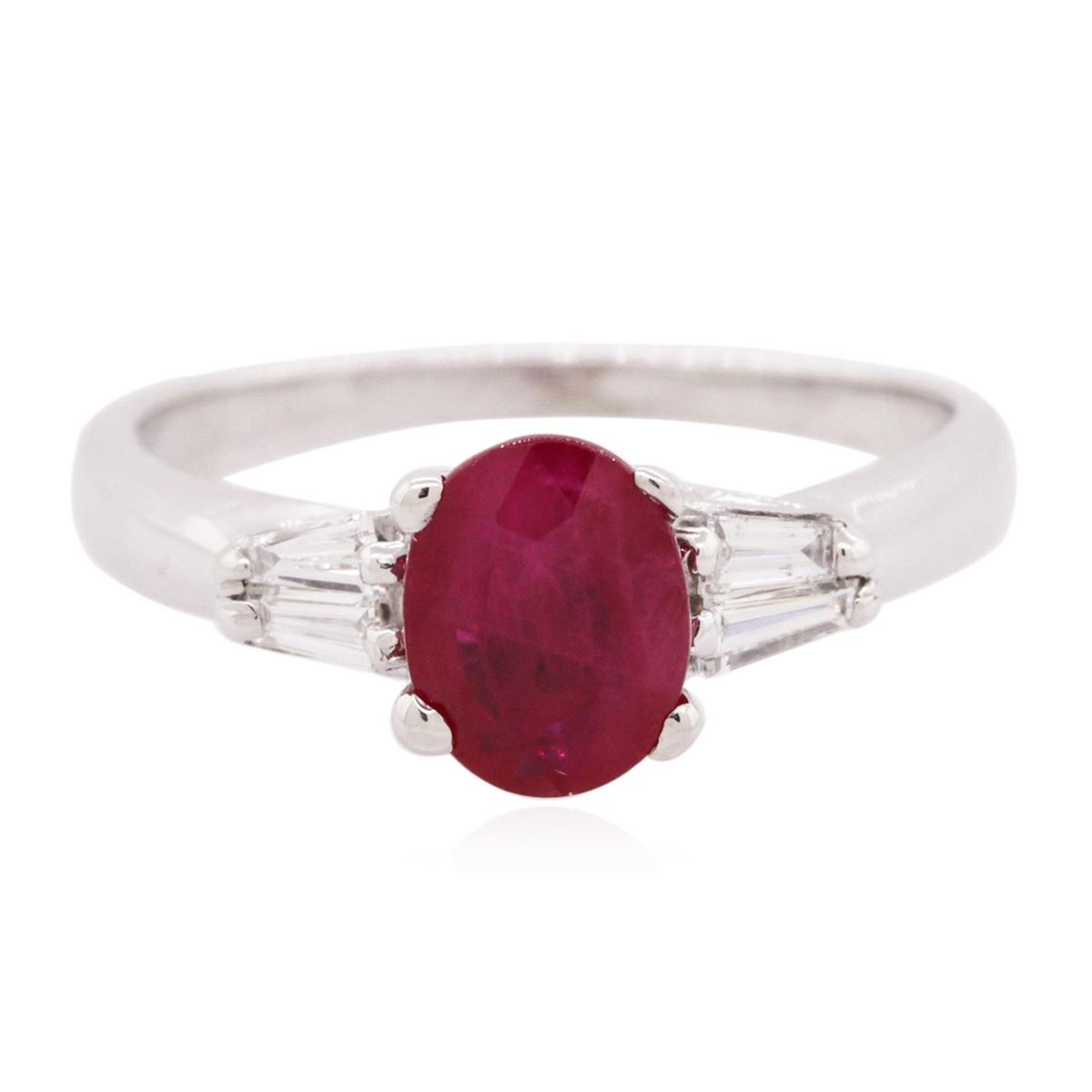 One ring featuring: 14KT white gold weighing 3.60 grams containing one ruby center stone with a total weight of 1.32ct and baguette cut diamonds with a total weight of 0.28cts.