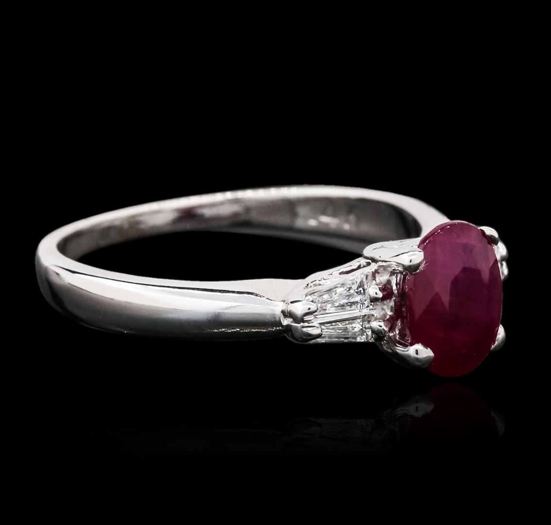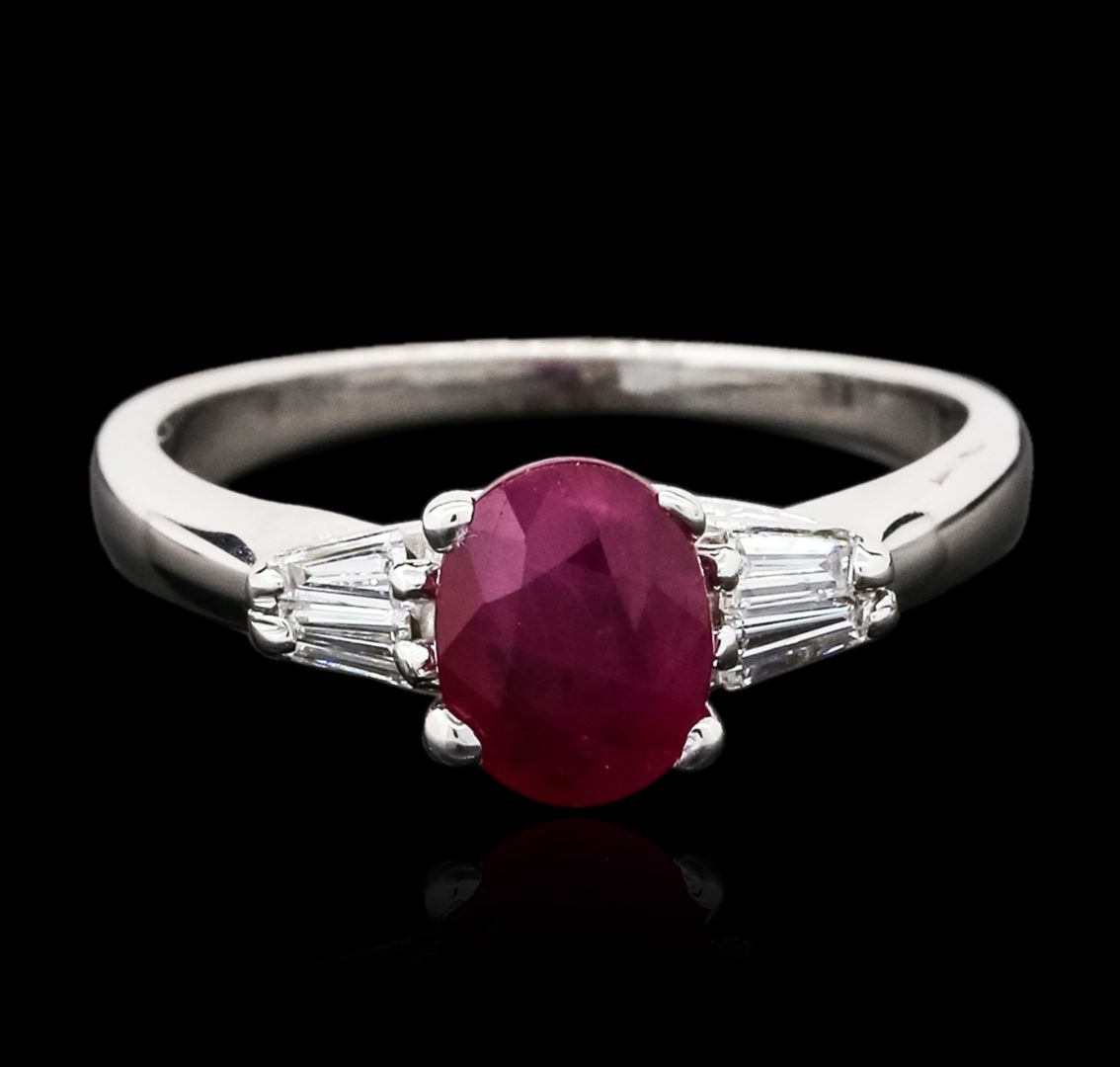 One ring featuring: 14KT white gold weighing 3.60 grams containing one ruby center stone with a total weight of 1.32ct and baguette cut diamonds with a total weight of 0.28cts.
