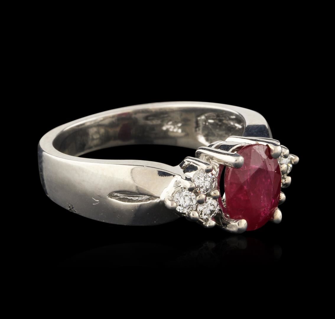 One electronically tested 14KT white gold ladies cast ruby and diamond ring with a bright polish finish. Identified with markings of "14K". Condition is new. Containing: One prong set oval modified brilliant cut natural ruby, measuring 7.80 x 6.20 x 3.20mm, approximate weight of 1.32ct., clarity is heavily included, medium, moderately strong, strongly purplish red color, (GIA stpR 5/4), cut is good. Six prong set round brilliant cut diamonds, measuring 2.10 - 2.10 x 1.26mm (depth est.) approximate total weight of 6 Stones = 0.20ct. Clarity: SI-1. Color: H - I, Cut is Good. Colored gemstones are presumed to have been subjected to commonly used enhancement processes. All diamonds and colored gemstones are graded in the mounting, unless otherwise stated. Total Weight of Colored Stones 1.32ct. Total Weight of Diamonds 0.20ct. Total Weight of Ring 5.70 grams. GGL Appraised at $3,200.00.