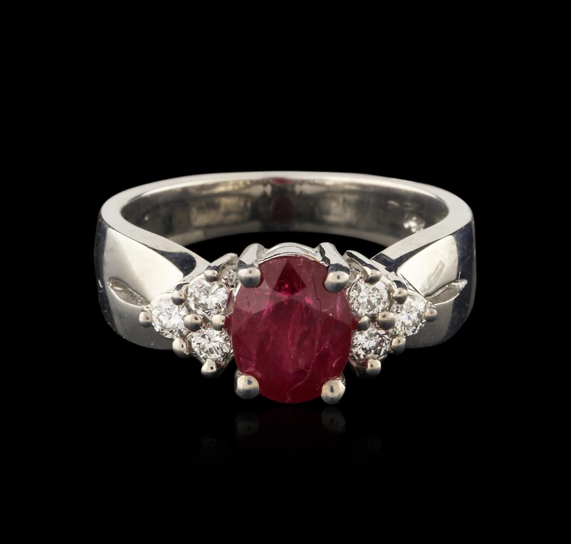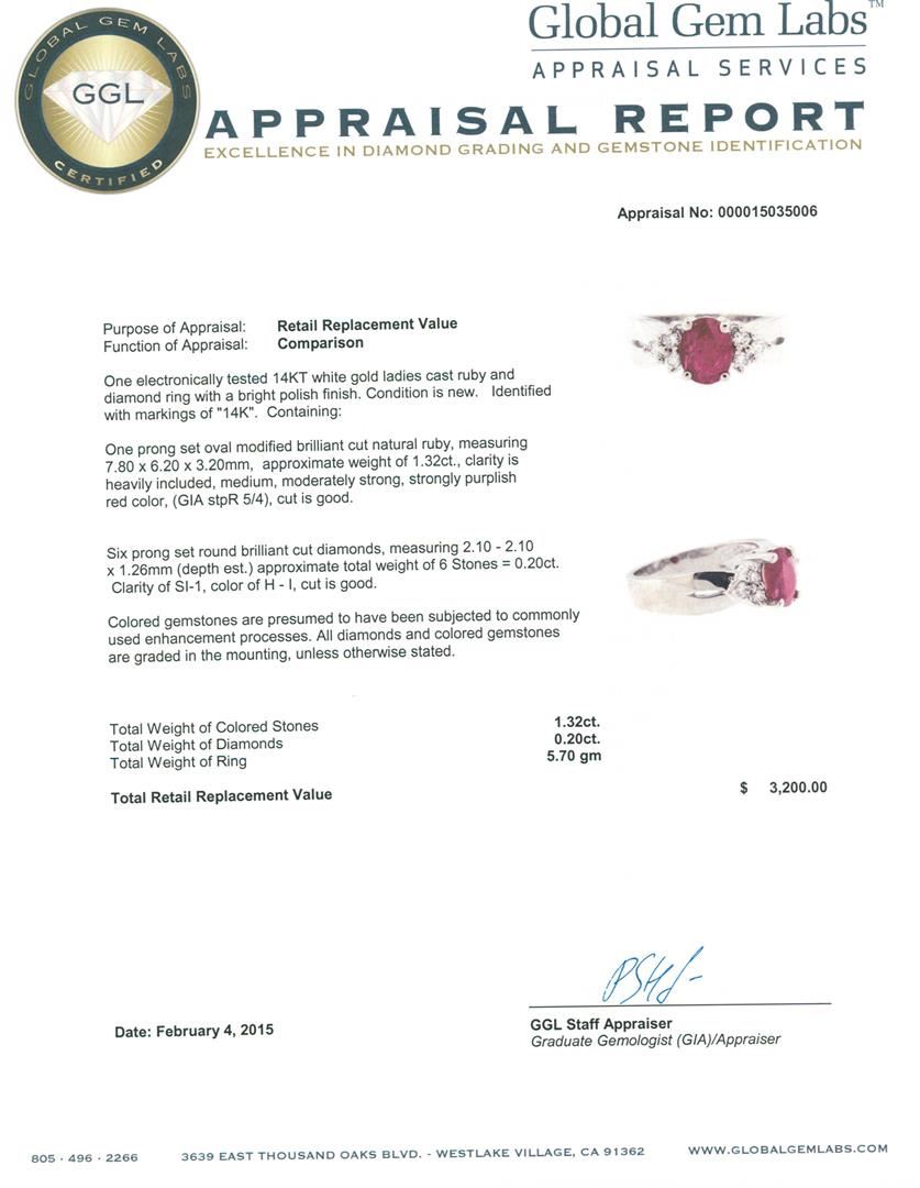 One electronically tested 14KT white gold ladies cast ruby and diamond ring with a bright polish finish. Identified with markings of "14K". Condition is new. Containing: One prong set oval modified brilliant cut natural ruby, measuring 7.80 x 6.20 x 3.20mm, approximate weight of 1.32ct., clarity is heavily included, medium, moderately strong, strongly purplish red color, (GIA stpR 5/4), cut is good. Six prong set round brilliant cut diamonds, measuring 2.10 - 2.10 x 1.26mm (depth est.) approximate total weight of 6 Stones = 0.20ct. Clarity: SI-1. Color: H - I, Cut is Good. Colored gemstones are presumed to have been subjected to commonly used enhancement processes. All diamonds and colored gemstones are graded in the mounting, unless otherwise stated. Total Weight of Colored Stones 1.32ct. Total Weight of Diamonds 0.20ct. Total Weight of Ring 5.70 grams. GGL Appraised at $3,200.00.