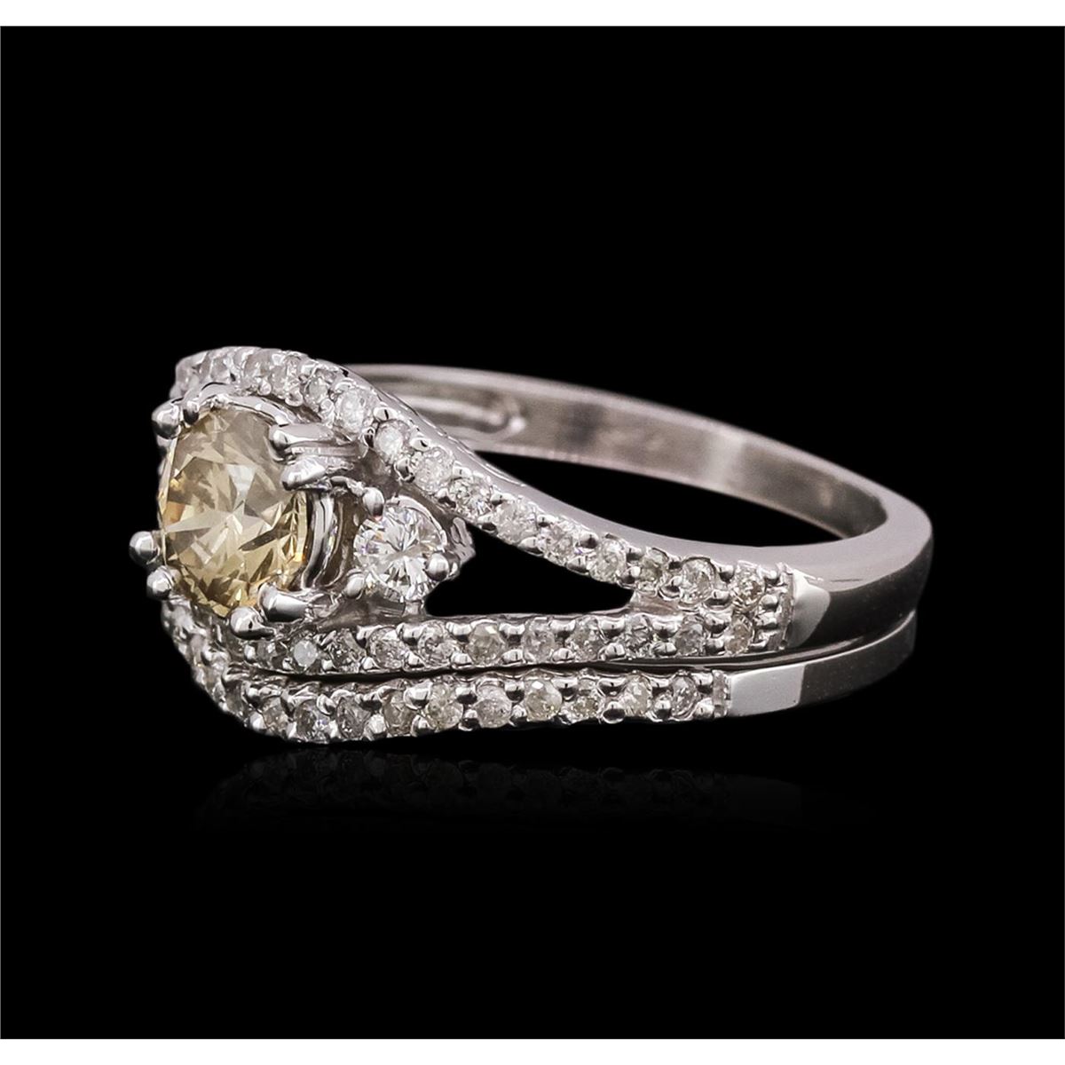 One electronically tested 14KT white gold ladies cast diamond engagement ring & guard with a bright polish finish. Condition is new. Containing: One prong set round brilliant cut diamond, measuring 5.95 - 5.50 x 3.44mm (depth est.) approximate weight of 0.69ct. Clarity: SI-2, Cut is Good. Two prong set round brilliant cut diamonds, measuring 2.50 - 2.50 x 1.50mm (depth est.) approximate total weight of 2 Stones = 0.11ct. Clarity: SI-1. Color: K, Cut is Good. Sixty-Five prong set round brilliant cut diamonds, measuring 1.30 - 1.30 x 0.78mm (depth est.) approximate total weight of 65 Stones = 0.52ct. Clarity: I-2. Color: J - K. All diamonds are graded in the mounting, unless otherwise stated. Total Weight of Diamonds 1.32ct. Total Weight of Engagement Ring & Guard 5.70 grams. GGL Appraised at $4,345.00.