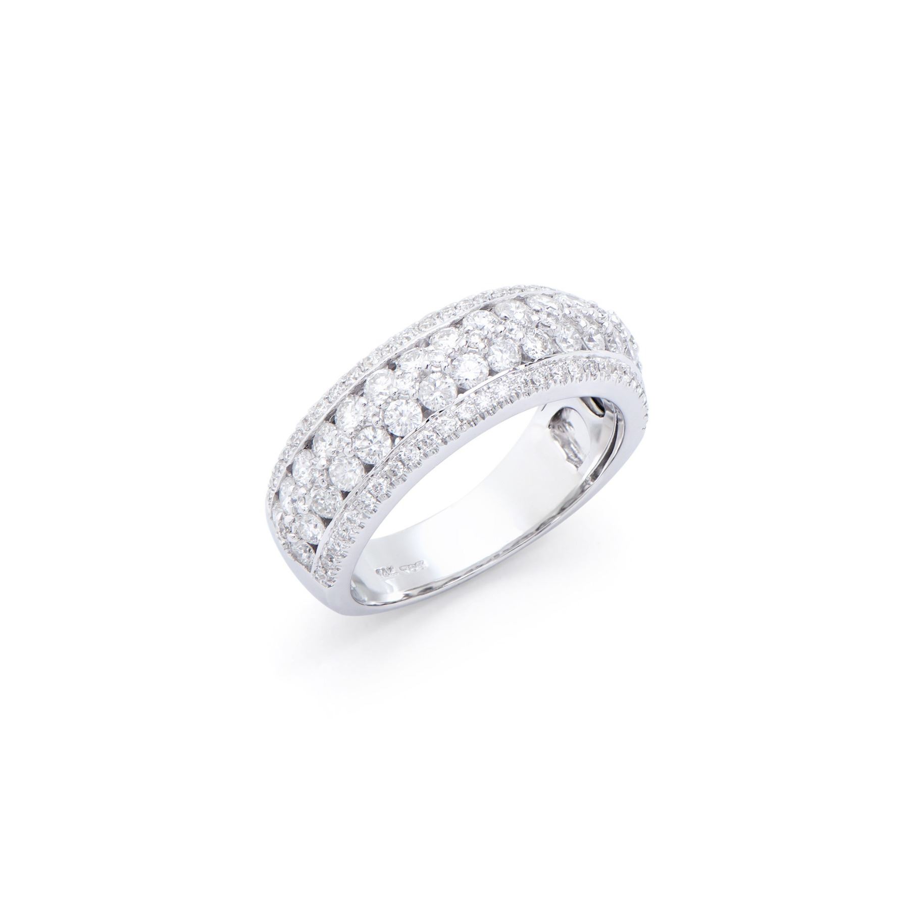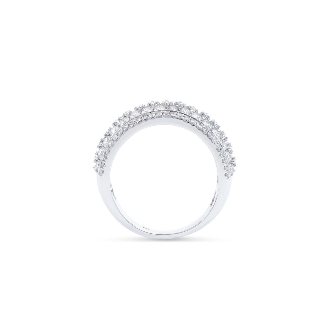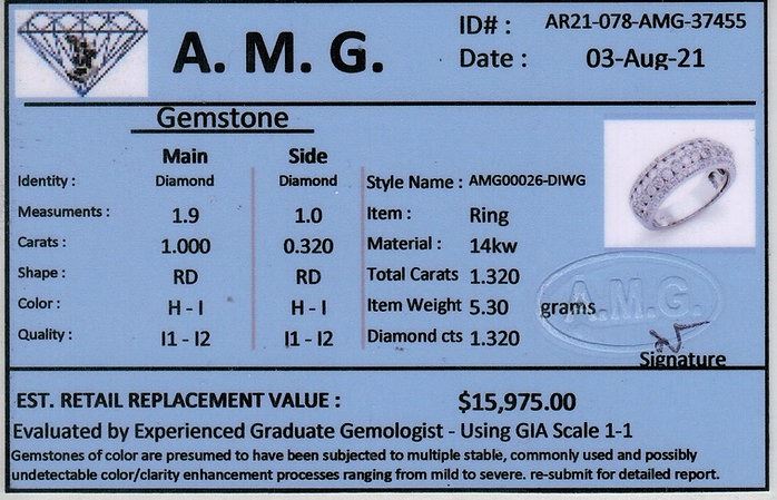 (32) Round Diamonds with a total weight of 1.00cts with a color of H-I and clarity of I1-I2. (69) Round Diamonds with a total weight of 0.32cts with a color of H-I and clarity of I1-I2.Total weight of this ring is 5.30 grams. Ring size is 7.5.