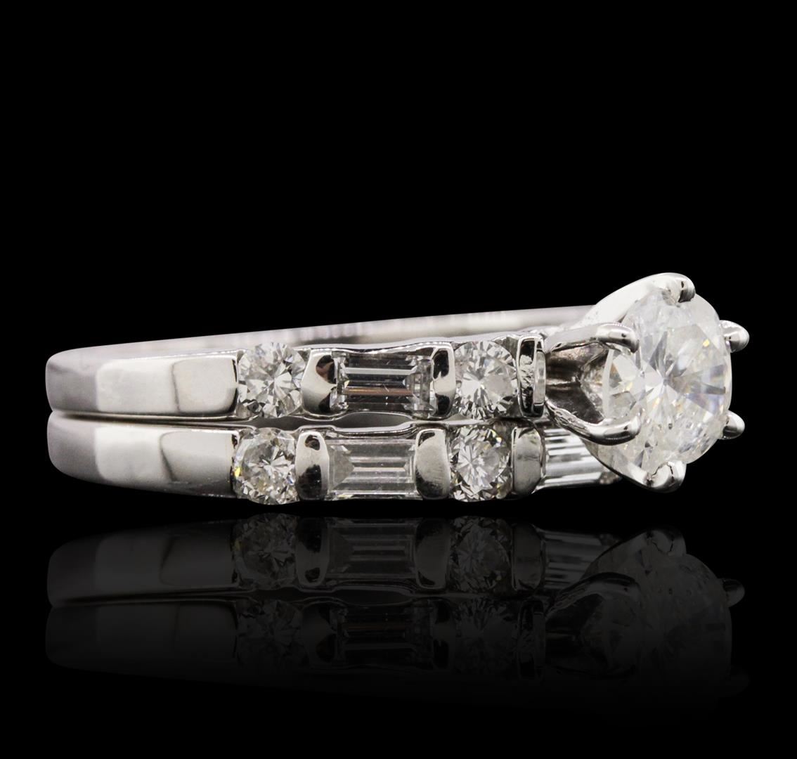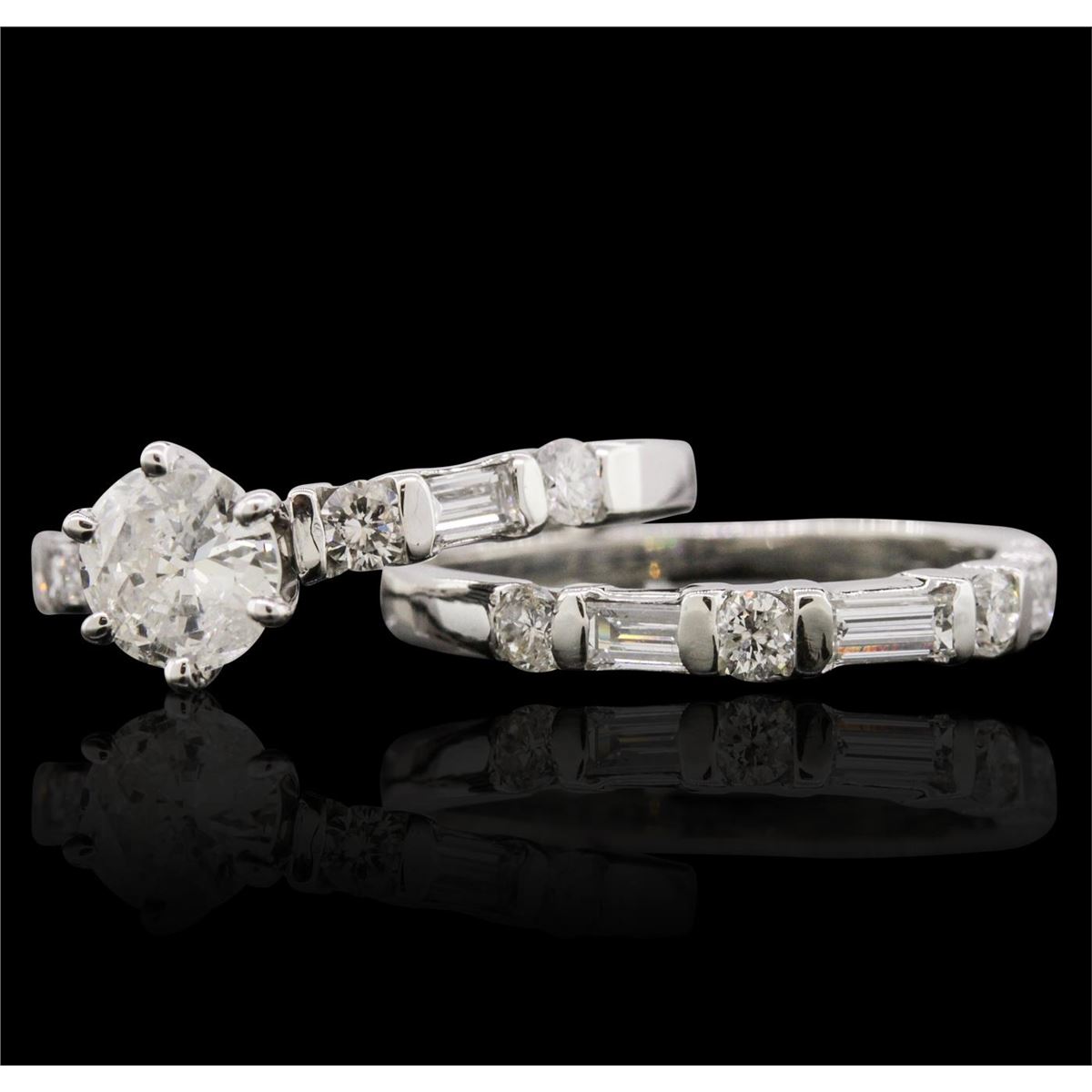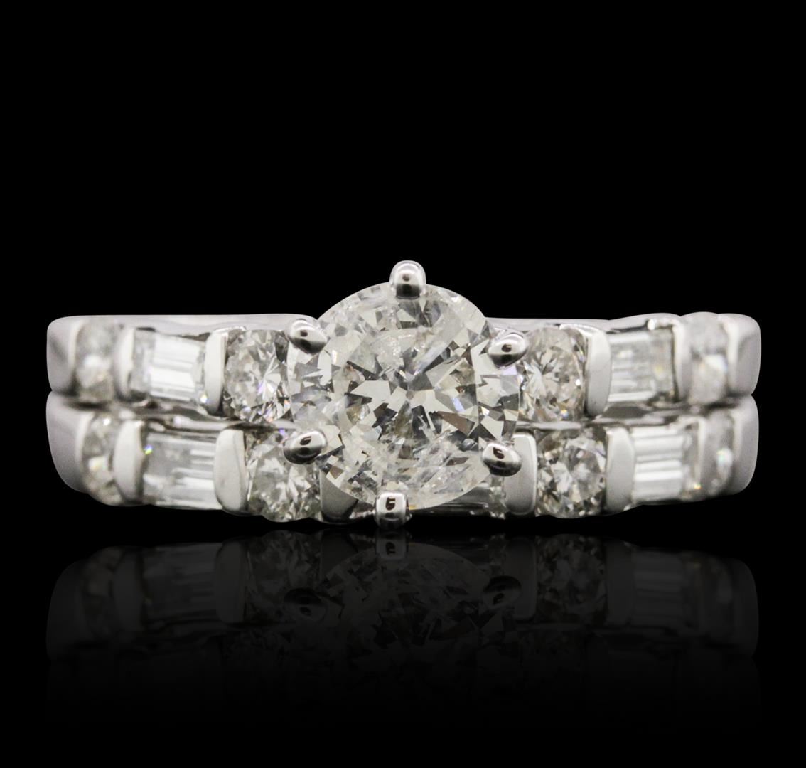 One electronically tested 14KT white gold Ladies combination cast & assembled engagement ring & wedding band with a bright polish finish. Condition is very good. Identified with markings of "14K". Containing: One prong set round brilliant cut diamond, measuring 5.90 - 5.90 x 3.54mm (depth est.) approximate weight of 0.75ct. Clarity: I-2. Color: J, Cut is Good. Eight prong set round brilliant cut diamonds, measuring 2.40 - 2.40 x 1.44mm (depth est.) approximate. Total Weight of 8 Stones = 0.41ct. Clarity: SI-2. Color: I, Cut is Good. Five prong set baguette cut diamonds, measuring 2.00 x 1.50 x 1.28mm (depth est.) approximate. Total Weight of 5 Stones = 0.18ct. Clarity: VS-2 to SI-1. Color: H - I, Cut is Good. All diamonds are graded in the mounting, unless otherwise stated. Total Weight of Diamonds 1.33ct. Total Weight of Engagement Ring & Wedding Band 4.40 grams.. GGL Appraised at $6,145.00.
