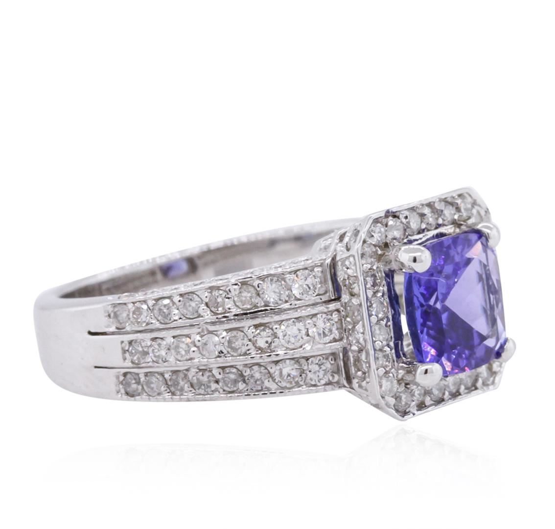 One electronically tested 14KT white gold ladies cast tanzanite and diamond ring. The featured tanzanite is set within a diamond bezel supported by a diamond set under gallery and diamond set shoulders, completed by a three and one-half millimeter wide band. Bright polish finish with milgrain detailing. Identified with markings of 14K. Condition is new, good workmanship. Containing: One prong set square cushion mixed cut natural tanzanite, measuring 6.45 x 6.50 x 3.80mm, 6% bulge factor, approximate weight of 1.33ct., clarity is eye clean, type I, medium dark, very slightly grayish, violetish blue color, (GIA vB 6/3), cut is good. Transmitting light with no distortion, transparent. Graded in the setting. Tanzanite is a very rare gemstone that is only found in the country of Tanzania. Originally discovered in 1967. Tiffany & Company, named the stone Tanzanite. It is found in the Usumburu Mountains that border the Umba Valley of northern Tanzania. Tanzanite occurs in gray, brown, violet, blue, reddish-purple, & green. The gem is interesting because of its exceptional pleochroism. Rotated in different directions a tanzanite will exhibit multiple changes of color. Tanzanite has a low tolerance to ultrasonic cleaning, and should not be cleaned using this method. One Hundred Thirty prong set round brilliant cut diamonds, measuring 1.50 - 1.20 x 0.81mm (depth est.) approximate total weight of 130 Stones = 1.27ct. Graded in the setting. Clarity: I-1 to I-3. Color: H - J. Total Weight of Colored Stones 1.33ct. Total Weight of Diamonds 1.27ct. Total Weight of Ring 5.91 grams. AIG Appraised at $6,700.00.