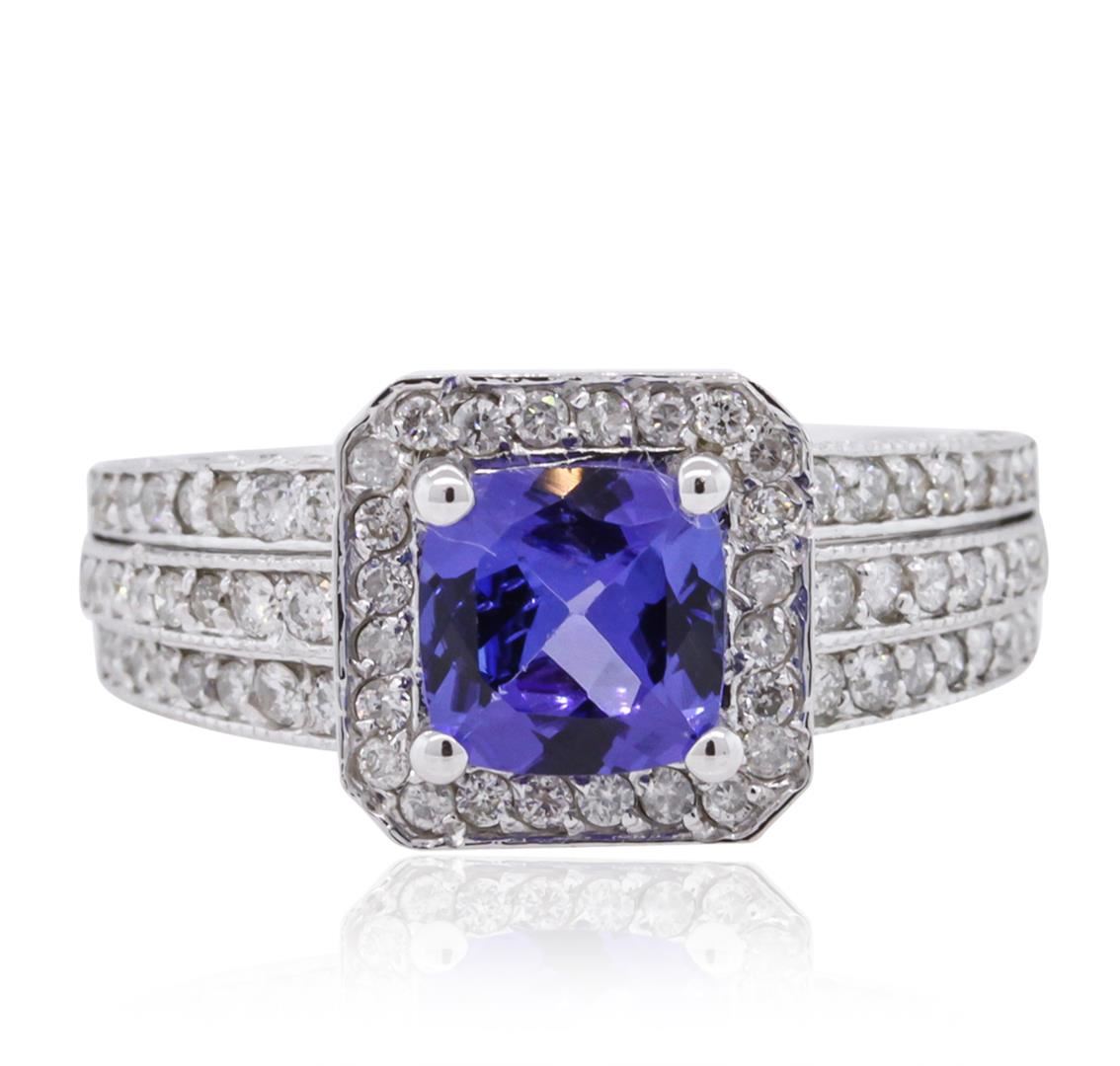 One electronically tested 14KT white gold ladies cast tanzanite and diamond ring. The featured tanzanite is set within a diamond bezel supported by a diamond set under gallery and diamond set shoulders, completed by a three and one-half millimeter wide band. Bright polish finish with milgrain detailing. Identified with markings of 14K. Condition is new, good workmanship. Containing: One prong set square cushion mixed cut natural tanzanite, measuring 6.45 x 6.50 x 3.80mm, 6% bulge factor, approximate weight of 1.33ct., clarity is eye clean, type I, medium dark, very slightly grayish, violetish blue color, (GIA vB 6/3), cut is good. Transmitting light with no distortion, transparent. Graded in the setting. Tanzanite is a very rare gemstone that is only found in the country of Tanzania. Originally discovered in 1967. Tiffany & Company, named the stone Tanzanite. It is found in the Usumburu Mountains that border the Umba Valley of northern Tanzania. Tanzanite occurs in gray, brown, violet, blue, reddish-purple, & green. The gem is interesting because of its exceptional pleochroism. Rotated in different directions a tanzanite will exhibit multiple changes of color. Tanzanite has a low tolerance to ultrasonic cleaning, and should not be cleaned using this method. One Hundred Thirty prong set round brilliant cut diamonds, measuring 1.50 - 1.20 x 0.81mm (depth est.) approximate total weight of 130 Stones = 1.27ct. Graded in the setting. Clarity: I-1 to I-3. Color: H - J. Total Weight of Colored Stones 1.33ct. Total Weight of Diamonds 1.27ct. Total Weight of Ring 5.91 grams. AIG Appraised at $6,700.00.