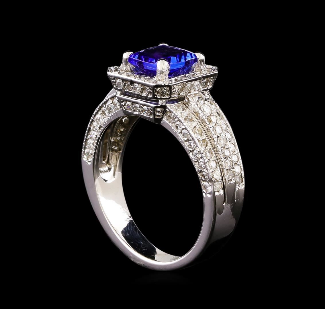 One electronically tested 14KT white gold ladies cast tanzanite and diamond ring. The featured tanzanite is set within a diamond bezel supported by a diamond set under gallery and diamond set shoulders, completed by a three and one-half millimeter wide band. Bright polish finish with milgrain detailing. Identified with markings of 14K. Condition is new, good workmanship. Containing: One prong set square cushion mixed cut natural tanzanite, measuring 6.45 x 6.50 x 3.80mm, 6% bulge factor, approximate weight of 1.33ct., clarity is eye clean, type I, medium dark, very slightly grayish, violetish blue color, (GIA vB 6/3), cut is good. Transmitting light with no distortion, transparent. Graded in the setting. Tanzanite is a very rare gemstone that is only found in the country of Tanzania. Originally discovered in 1967. Tiffany & Company, named the stone Tanzanite. It is found in the Usumburu Mountains that border the Umba Valley of northern Tanzania. Tanzanite occurs in gray, brown, violet, blue, reddish-purple, & green. The gem is interesting because of its exceptional pleochroism. Rotated in different directions a tanzanite will exhibit multiple changes of color. Tanzanite has a low tolerance to ultrasonic cleaning, and should not be cleaned using this method. One Hundred Thirty prong set round brilliant cut diamonds, measuring 1.50 - 1.20 x 0.81mm (depth est.) approximate total weight of 130 Stones = 1.27ct. Graded in the setting. Clarity: I-1 to I-3. Color: H - J. Total Weight of Colored Stones 1.33ct. Total Weight of Diamonds 1.27ct. Total Weight of Ring 5.91 grams. AIG Appraised at $6,700.00.