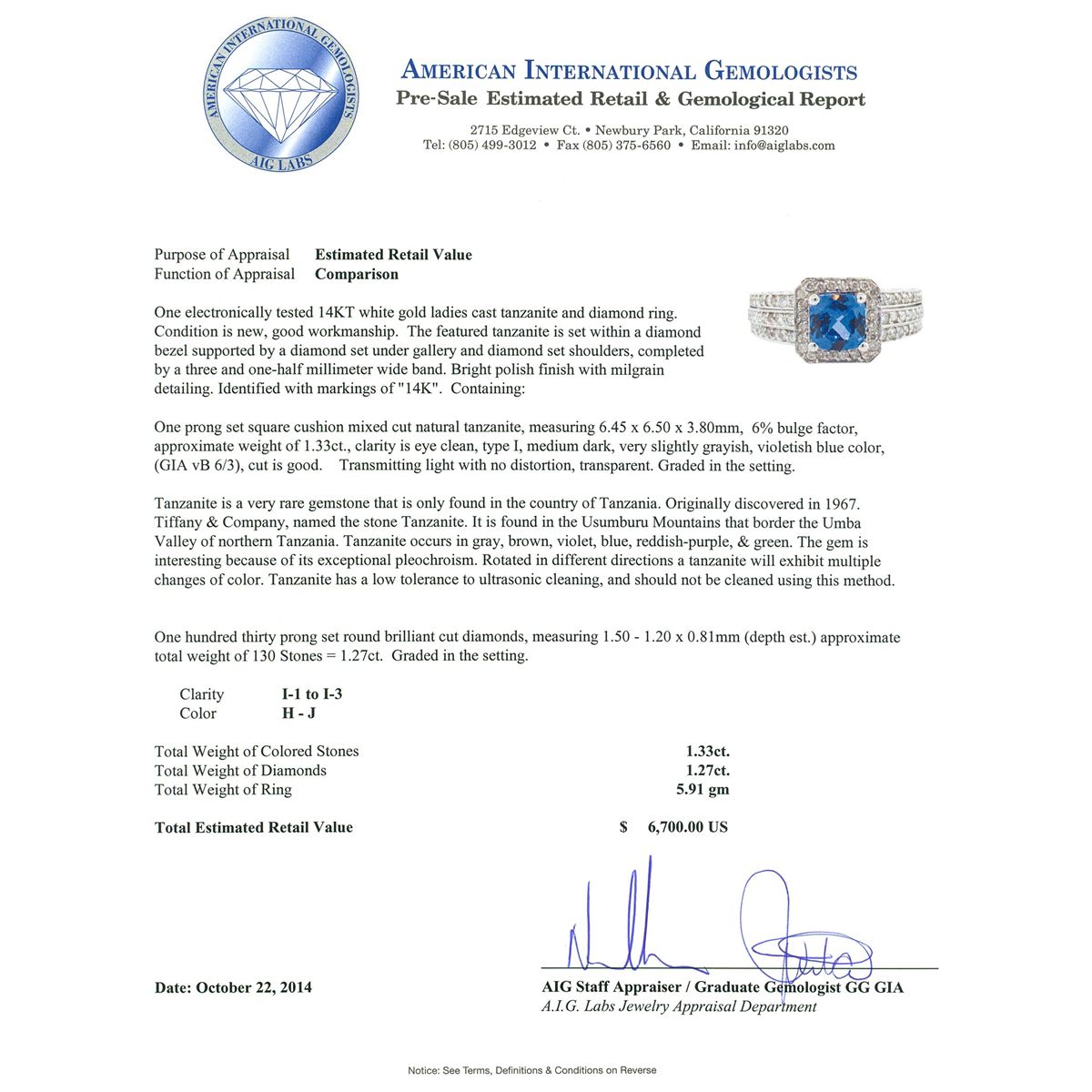 One electronically tested 14KT white gold ladies cast tanzanite and diamond ring. The featured tanzanite is set within a diamond bezel supported by a diamond set under gallery and diamond set shoulders, completed by a three and one-half millimeter wide band. Bright polish finish with milgrain detailing. Identified with markings of 14K. Condition is new, good workmanship. Containing: One prong set square cushion mixed cut natural tanzanite, measuring 6.45 x 6.50 x 3.80mm, 6% bulge factor, approximate weight of 1.33ct., clarity is eye clean, type I, medium dark, very slightly grayish, violetish blue color, (GIA vB 6/3), cut is good. Transmitting light with no distortion, transparent. Graded in the setting. Tanzanite is a very rare gemstone that is only found in the country of Tanzania. Originally discovered in 1967. Tiffany & Company, named the stone Tanzanite. It is found in the Usumburu Mountains that border the Umba Valley of northern Tanzania. Tanzanite occurs in gray, brown, violet, blue, reddish-purple, & green. The gem is interesting because of its exceptional pleochroism. Rotated in different directions a tanzanite will exhibit multiple changes of color. Tanzanite has a low tolerance to ultrasonic cleaning, and should not be cleaned using this method. One Hundred Thirty prong set round brilliant cut diamonds, measuring 1.50 - 1.20 x 0.81mm (depth est.) approximate total weight of 130 Stones = 1.27ct. Graded in the setting. Clarity: I-1 to I-3. Color: H - J. Total Weight of Colored Stones 1.33ct. Total Weight of Diamonds 1.27ct. Total Weight of Ring 5.91 grams. AIG Appraised at $6,700.00.