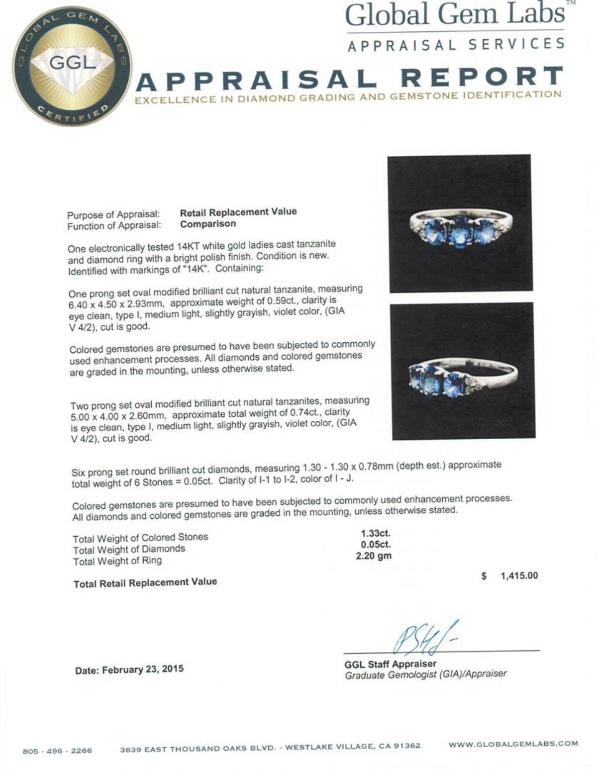 One electronically tested 14KT white gold ladies cast tanzanite and diamond ring with a bright polish finish. Identified with markings of "14K". Condition is new. Containing: One prong set oval modified brilliant cut natural tanzanite, measuring 6.40 x 4.50 x 2.93mm, approximate weight of 0.59ct., clarity is eye clean, type I, medium light, slightly grayish, violet color, (GIA V 4/2), cut is good. Two prong set oval modified brilliant cut natural tanzanites, measuring 5.00 x 4.00 x 2.60mm, approximate total weight of 0.74ct., clarity is eye clean, type I, medium light, slightly grayish, violet color, (GIA V 4/2), cut is good. Six prong set round brilliant cut diamonds, measuring 1.30 - 1.30 x 0.78mm (depth est.) approximate total weight of 6 Stones = 0.05ct. Clarity: I-1 to I-2. Color: I - J. Colored gemstones are presumed to have been subjected to commonly used enhancement processes. Colored gemstones are presumed to have been subjected to commonly used enhancement processes. All diamonds and colored gemstones are graded in the mounting, unless otherwise stated. All diamonds and colored gemstones are graded in the mounting, unless otherwise stated. Total Weight of Colored Stones 1.33ct. Total Weight of Diamonds 0.05ct. Total Weight of Ring 2.20 grams. GGL Appraised.