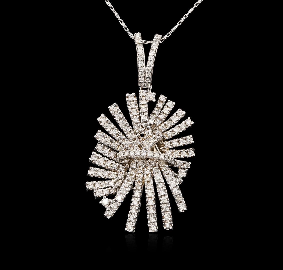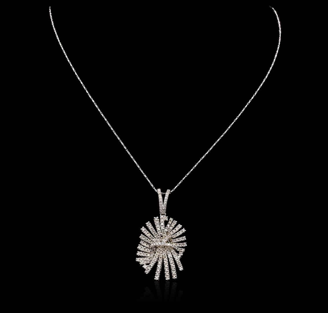 One electronically tested 14KT white gold ladies cast diamond pendant & chain 18.0" long, with a lobster claw clasp with a bright polish finish. Identified with markings of "14K". Condition is new. Containing: One Hundred Sixty-Seven prong set round brilliant cut diamonds, measuring 1.30 - 1.30 x 0.78mm (depth est.) approximate total weight of 167 Stones = 1.34ct. Clarity: I-1. Color: I - J. All diamonds are graded in the mounting, unless otherwise stated. Total Weight of Diamonds 1.34ct. Total Weight of Pendant & Chain 11.10 grams. GGL Appraised at $5,185.00.