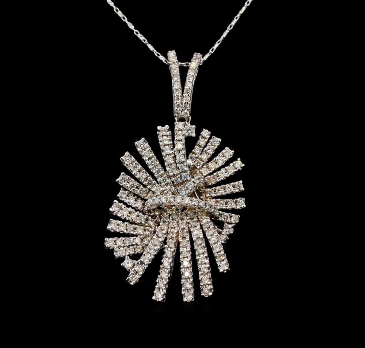 One electronically tested 14KT white gold ladies cast diamond pendant & chain 18.0" long, with a lobster claw clasp with a bright polish finish. Identified with markings of "14K". Condition is new. Containing: One Hundred Sixty-Seven prong set round brilliant cut diamonds, measuring 1.30 - 1.30 x 0.78mm (depth est.) approximate total weight of 167 Stones = 1.34ct. Clarity: I-1. Color: I - J. All diamonds are graded in the mounting, unless otherwise stated. Total Weight of Diamonds 1.34ct. Total Weight of Pendant & Chain 11.10 grams. GGL Appraised.