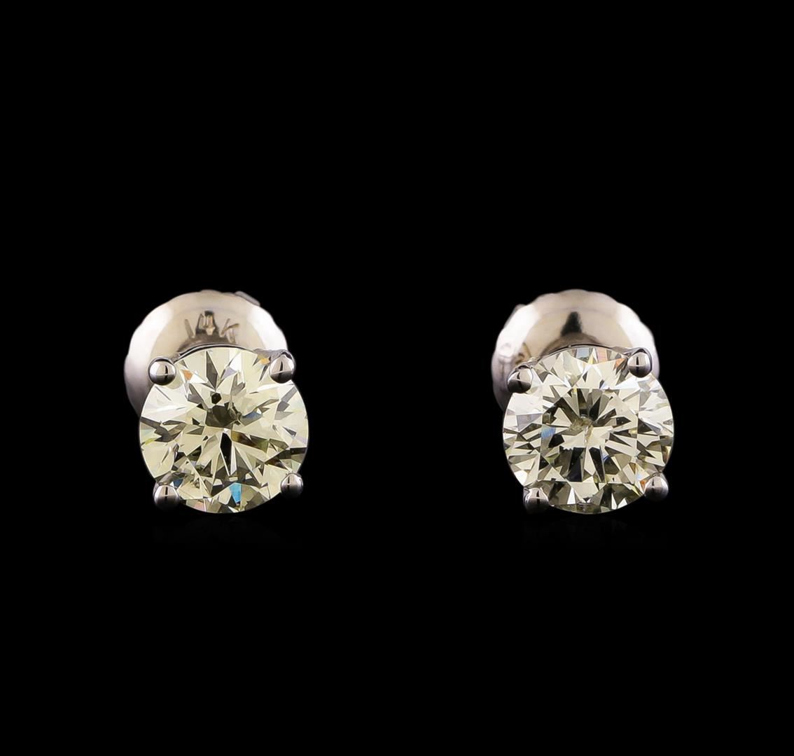 One pair electronically tested 14KT white gold cast & assembled diamond solitaire earrings with screw backs. Bright polish finish. Condition is new, good workmanship. Containing: One prong set round brilliant cut diamond, measuring 5.38 - 5.37 x 3.23mm (depth est.) approximate weight of 0.67ct with a faint blue fluorescence. Graded in the setting. Clarity: I-1. Depth: 60.0%. Table 63.2%. One prong set round brilliant cut diamond, measuring 5.30 - 5.29 x 3.35mm (depth est.) approximate weight of 0.67ct with a strong blue fluorescence. Graded in the setting. Clarity: SI-2. Depth: 63.2%. Table 57.6%. Total Weight of Diamonds 1.34ct. Total Weight of Earrings 0.98 grams. AIG Appraised at $4,455.00.