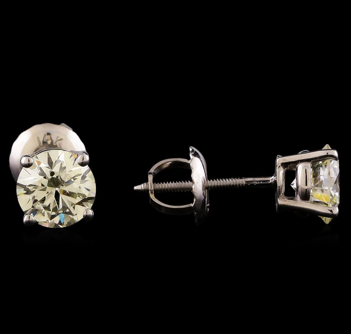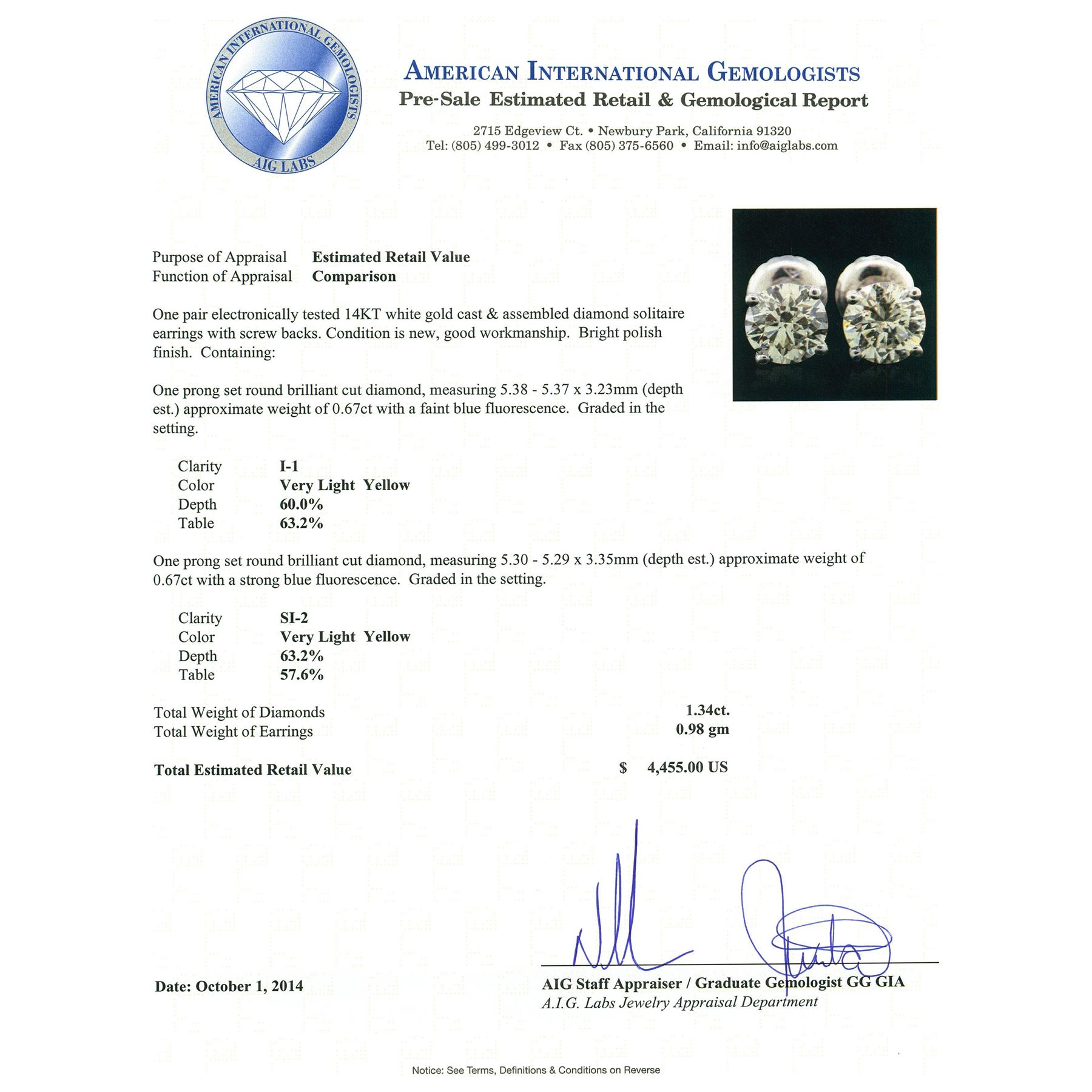One pair electronically tested 14KT white gold cast & assembled diamond solitaire earrings with screw backs. Bright polish finish. Condition is new, good workmanship. Containing: One prong set round brilliant cut diamond, measuring 5.38 - 5.37 x 3.23mm (depth est.) approximate weight of 0.67ct with a faint blue fluorescence. Graded in the setting. Clarity: I-1. Depth: 60.0%. Table 63.2%. One prong set round brilliant cut diamond, measuring 5.30 - 5.29 x 3.35mm (depth est.) approximate weight of 0.67ct with a strong blue fluorescence. Graded in the setting. Clarity: SI-2. Depth: 63.2%. Table 57.6%. Total Weight of Diamonds 1.34ct. Total Weight of Earrings 0.98 grams. AIG Appraised at $4,455.00.