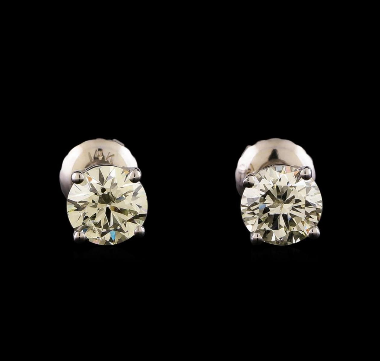 One pair electronically tested 14KT white gold cast & assembled diamond solitaire earrings with screw backs. Bright polish finish. Condition is new, good workmanship. Containing: One prong set round brilliant cut diamond, measuring 5.38 - 5.37 x 3.23mm (depth est.) approximate weight of 0.67ct with a faint blue fluorescence. Graded in the setting. Clarity: I-1. Depth: 60.0%. Table 63.2%. One prong set round brilliant cut diamond, measuring 5.30 - 5.29 x 3.35mm (depth est.) approximate weight of 0.67ct with a strong blue fluorescence. Graded in the setting. Clarity: SI-2. Depth: 63.2%. Table 57.6%. Total Weight of Diamonds 1.34ct. Total Weight of Earrings 0.98 grams. AIG Appraised.