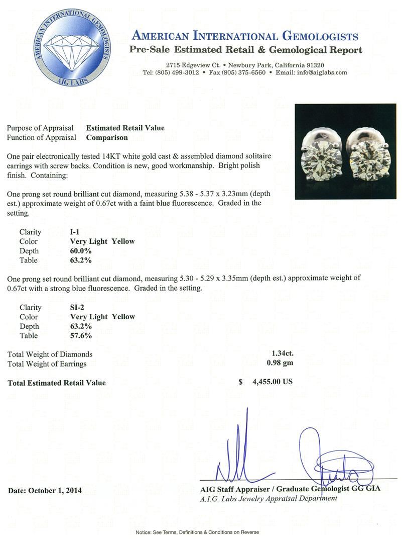 One pair electronically tested 14KT white gold cast & assembled diamond solitaire earrings with screw backs. Bright polish finish. Condition is new, good workmanship. Containing: One prong set round brilliant cut diamond, measuring 5.38 - 5.37 x 3.23mm (depth est.) approximate weight of 0.67ct with a faint blue fluorescence. Graded in the setting. Clarity: I-1. Depth: 60.0%. Table 63.2%. One prong set round brilliant cut diamond, measuring 5.30 - 5.29 x 3.35mm (depth est.) approximate weight of 0.67ct with a strong blue fluorescence. Graded in the setting. Clarity: SI-2. Depth: 63.2%. Table 57.6%. Total Weight of Diamonds 1.34ct. Total Weight of Earrings 0.98 grams. AIG Appraised.
