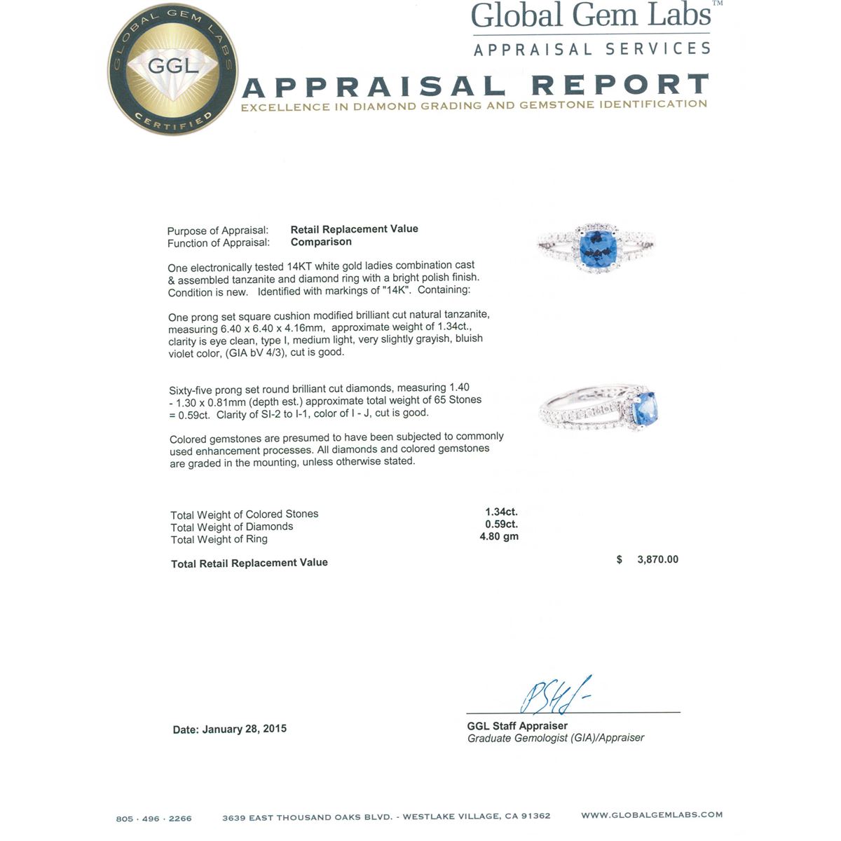 One electronically tested 14KT white gold ladies combination cast & assembled tanzanite and diamond ring with a bright polish finish. Identified with markings of "14K". Condition is new. Containing: One prong set square cushion modified brilliant cut natural tanzanite, measuring 6.40 x 6.40 x 4.16mm, approximate weight of 1.34ct., clarity is eye clean, type I, medium light, very slightly grayish, bluish violet color, (GIA bV 4/3), cut is good. Sixty-Five prong set round brilliant cut diamonds, measuring 1.40 - 1.30 x 0.81mm (depth est.) approximate total weight of 65 Stones = 0.59ct. Clarity: SI-2 to I-1. Color: I - J, Cut is Good. Colored gemstones are presumed to have been subjected to commonly used enhancement processes. All diamonds and colored gemstones are graded in the mounting, unless otherwise stated. Total Weight of Colored Stones 1.34ct. Total Weight of Diamonds 0.59ct. Total Weight of Ring 4.80 grams. GGL Appraised at $3,870.00.