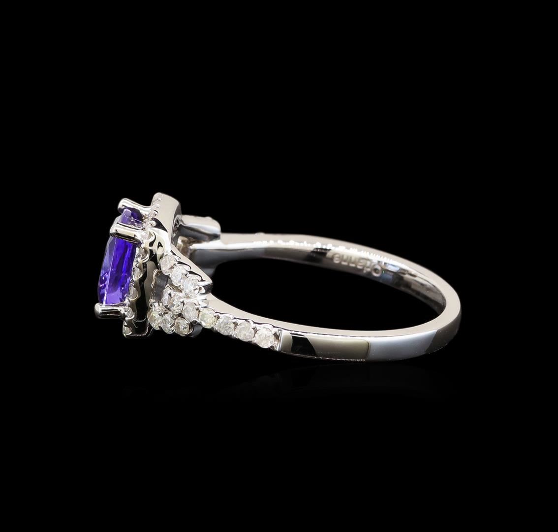 One electronically tested 14KT white gold ladies cast tanzanite and diamond ring with a flat shank with a bright polish finish. Trademark is Orianne. Identified with markings of "14K". Condition is new. Containing: One prong set square cushion modified brilliant cut natural tanzanite, measuring 6.40 x 6.40 x 4.16mm, approximate weight of 1.34ct., clarity is eye clean, type I, medium light, very slightly grayish, violet color, (GIA V 4/3), cut is good. Forty-Six channel set round brilliant cut diamonds, measuring 1.20 - 1.20 x 0.72mm (depth est.) approximate total weight of 46 Stones = 0.29ct. Clarity: I-1 to I-2. Color: I - J. All diamonds and colored gemstones are graded in the mounting, unless otherwise stated. Colored gemstones are presumed to have been subjected to commonly used enhancement processes.. Total Weight of Colored Stones 1.34ct. Total Weight of Diamonds 0.29ct. Total Weight of Ring 3.20 grams. GGL Appraised at $2,240.00.