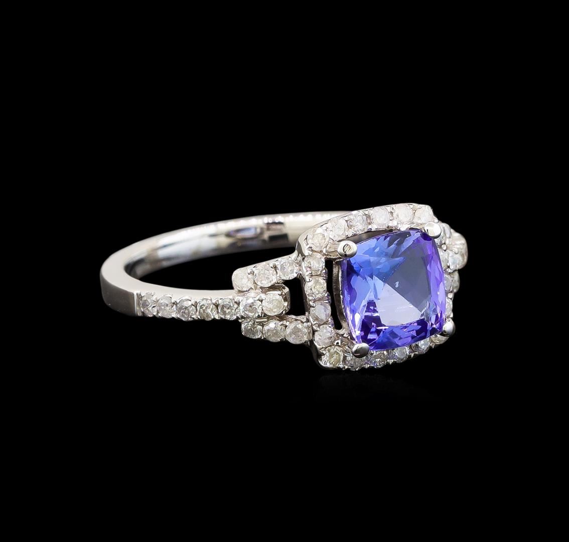 One electronically tested 14KT white gold ladies cast tanzanite and diamond ring with a flat shank with a bright polish finish. Trademark is Orianne. Identified with markings of "14K". Condition is new. Containing: One prong set square cushion modified brilliant cut natural tanzanite, measuring 6.40 x 6.40 x 4.16mm, approximate weight of 1.34ct., clarity is eye clean, type I, medium light, very slightly grayish, violet color, (GIA V 4/3), cut is good. Forty-Six channel set round brilliant cut diamonds, measuring 1.20 - 1.20 x 0.72mm (depth est.) approximate total weight of 46 Stones = 0.29ct. Clarity: I-1 to I-2. Color: I - J. All diamonds and colored gemstones are graded in the mounting, unless otherwise stated. Colored gemstones are presumed to have been subjected to commonly used enhancement processes.. Total Weight of Colored Stones 1.34ct. Total Weight of Diamonds 0.29ct. Total Weight of Ring 3.20 grams. GGL Appraised at $2,240.00.