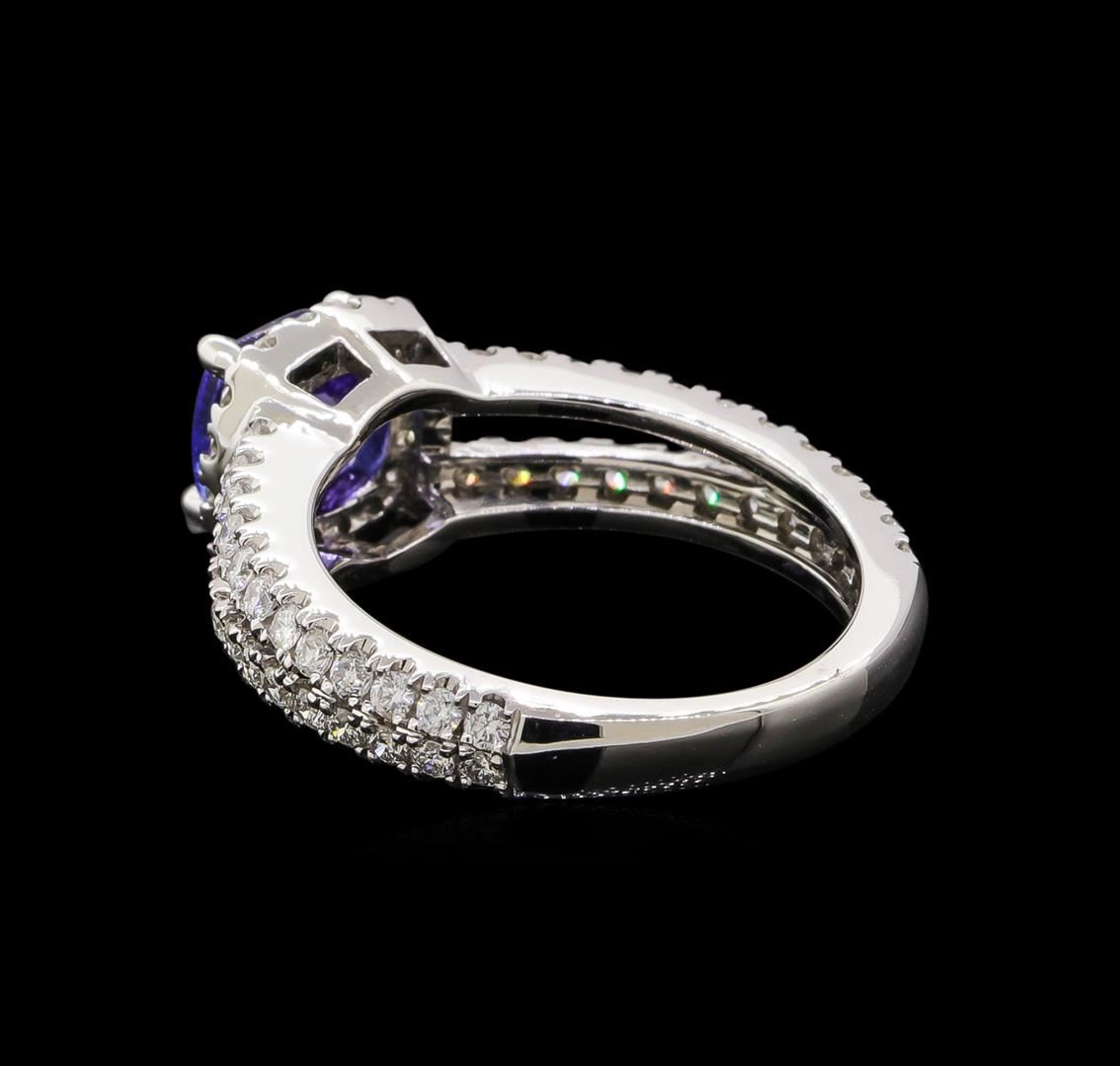 One electronically tested 14KT white gold ladies combination cast & assembled tanzanite and diamond ring with a bright polish finish. Identified with markings of "14K". Condition is new. Containing: One prong set square cushion modified brilliant cut natural tanzanite, measuring 6.40 x 6.40 x 4.16mm, approximate weight of 1.34ct., clarity is eye clean, type I, medium light, very slightly grayish, bluish violet color, (GIA bV 4/3), cut is good. Sixty-Five prong set round brilliant cut diamonds, measuring 1.40 - 1.30 x 0.81mm (depth est.) approximate total weight of 65 Stones = 0.59ct. Clarity: SI-2 to I-1. Color: I - J, Cut is Good. Colored gemstones are presumed to have been subjected to commonly used enhancement processes. All diamonds and colored gemstones are graded in the mounting, unless otherwise stated. Total Weight of Colored Stones 1.34ct. Total Weight of Diamonds 0.59ct. Total Weight of Ring 4.80 grams. GGL Appraised at $3,870.00.