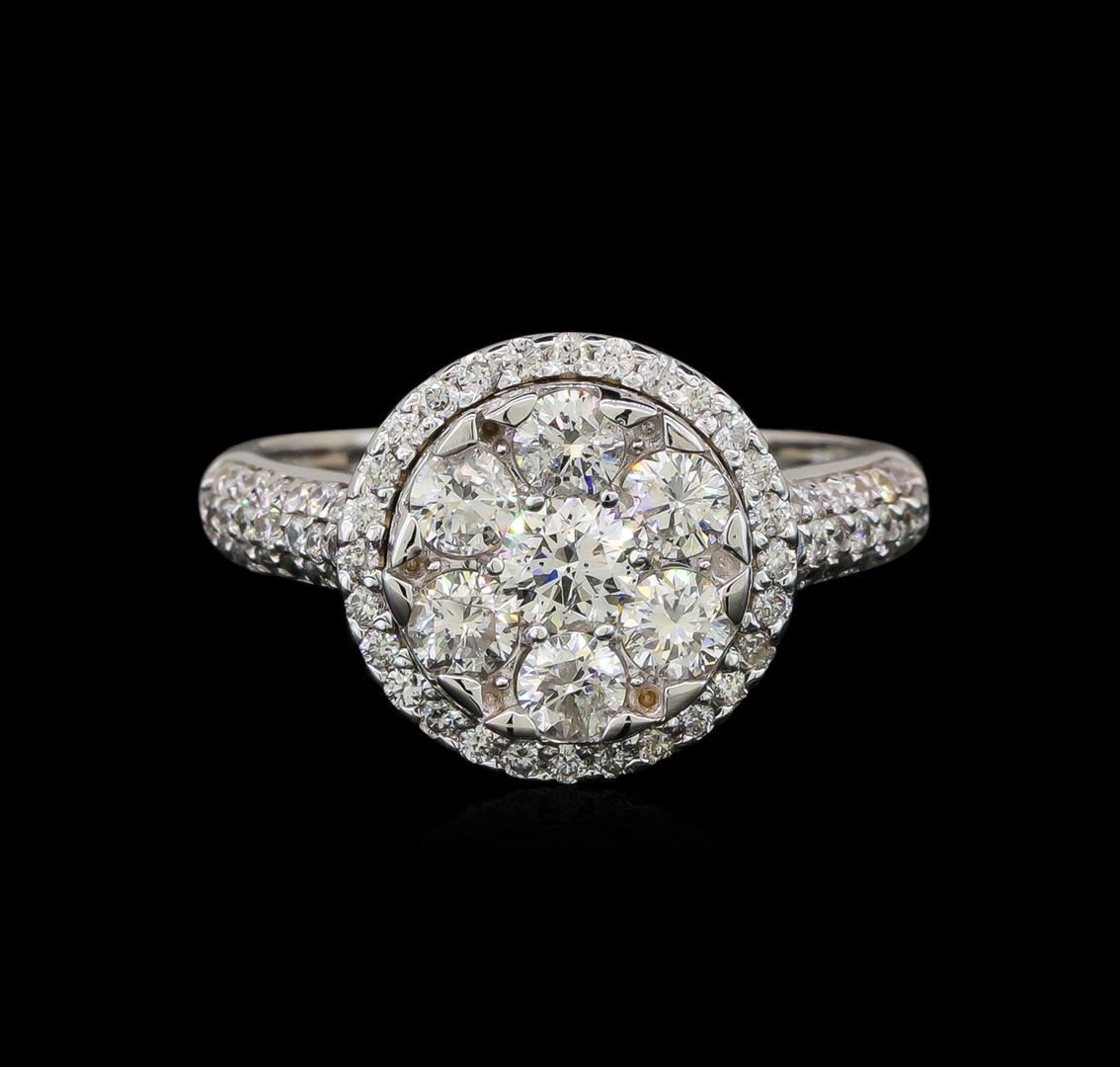One electronically tested 14KT white gold ladies cast diamond ring with a cathedral shank with a bright polish finish. Identified with markings of "K14". Condition is new. Containing: One prong set round brilliant cut diamond, measuring 4.00 - 4.00 x 2.40mm (depth est.) approximate weight of 0.22ct. Clarity: SI-2. Color: I, Cut is Good. Six prong set round brilliant cut diamonds, measuring 2.90 - 2.90 x 1.74mm (depth est.) approximate total weight of 6 Stones = 0.54ct. Clarity: SI-1 to SI-2. Color: I - J, Cut is Good. Seventy-Seven prong set round brilliant cut diamonds, measuring 1.10 - 1.10 x 0.66mm (depth est.) approximate total weight of 77 Stones = 0.59ct. Clarity: SI-2 to I-1. Color: H - I, Cut is Good. All diamonds are graded in the mounting, unless otherwise stated. Total Weight of Diamonds 1.35ct. Total Weight of Ring 5.60 grams. GGL Appraised.