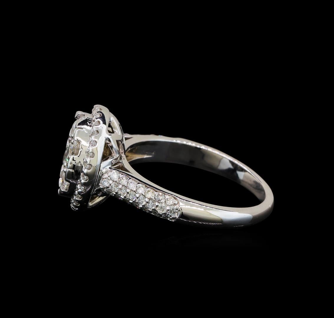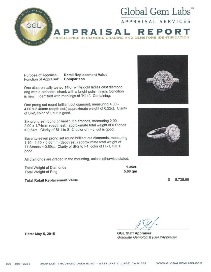 One electronically tested 14KT white gold ladies cast diamond ring with a cathedral shank with a bright polish finish. Identified with markings of "K14". Condition is new. Containing: One prong set round brilliant cut diamond, measuring 4.00 - 4.00 x 2.40mm (depth est.) approximate weight of 0.22ct. Clarity: SI-2. Color: I, Cut is Good. Six prong set round brilliant cut diamonds, measuring 2.90 - 2.90 x 1.74mm (depth est.) approximate total weight of 6 Stones = 0.54ct. Clarity: SI-1 to SI-2. Color: I - J, Cut is Good. Seventy-Seven prong set round brilliant cut diamonds, measuring 1.10 - 1.10 x 0.66mm (depth est.) approximate total weight of 77 Stones = 0.59ct. Clarity: SI-2 to I-1. Color: H - I, Cut is Good. All diamonds are graded in the mounting, unless otherwise stated. Total Weight of Diamonds 1.35ct. Total Weight of Ring 5.60 grams. GGL Appraised.