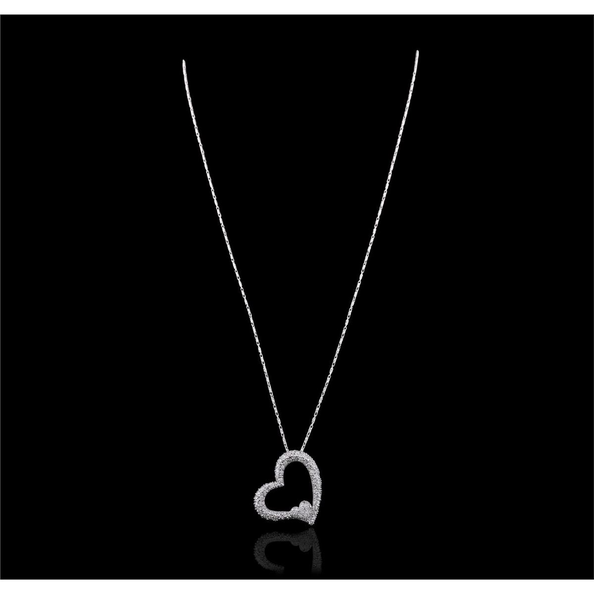 One electronically tested 14KT white gold ladies cast & assembled diamond " heart " pendant with chain. The pendant is completed by an eighteen inch 14KT white gold designer style chain, terminating in a lobster clasp. Bright polish finish Condition is new, good workmanship. Containing: One Hundred Eleven bead set round brilliant cut diamonds, measuring 1.60 - 1.30 x 0.87mm (depth est.) approximate total weight of 111 Stones = 1.35ct. The below listed clarity & color grade reflect an overall range for the group. Graded in the setting. Clarity: SI-1 to I-2. Color: F - I. Total Weight of Diamonds 1.35ct. Total Weight of Pendant With Chain 7.74 grams. AIG Appraised at $5,210.00.