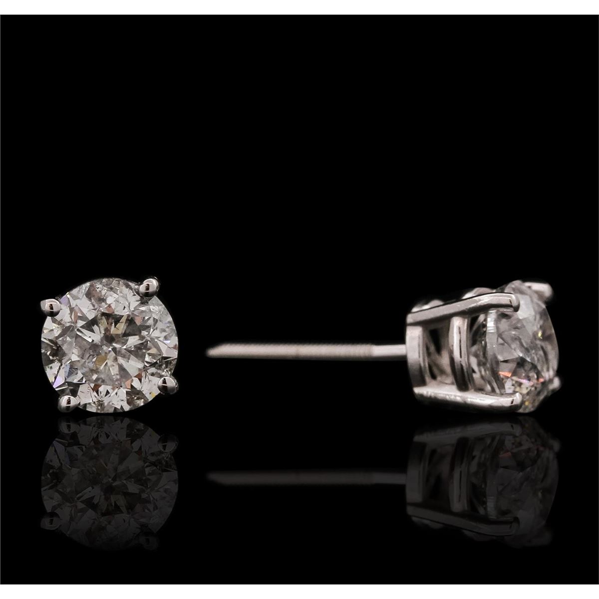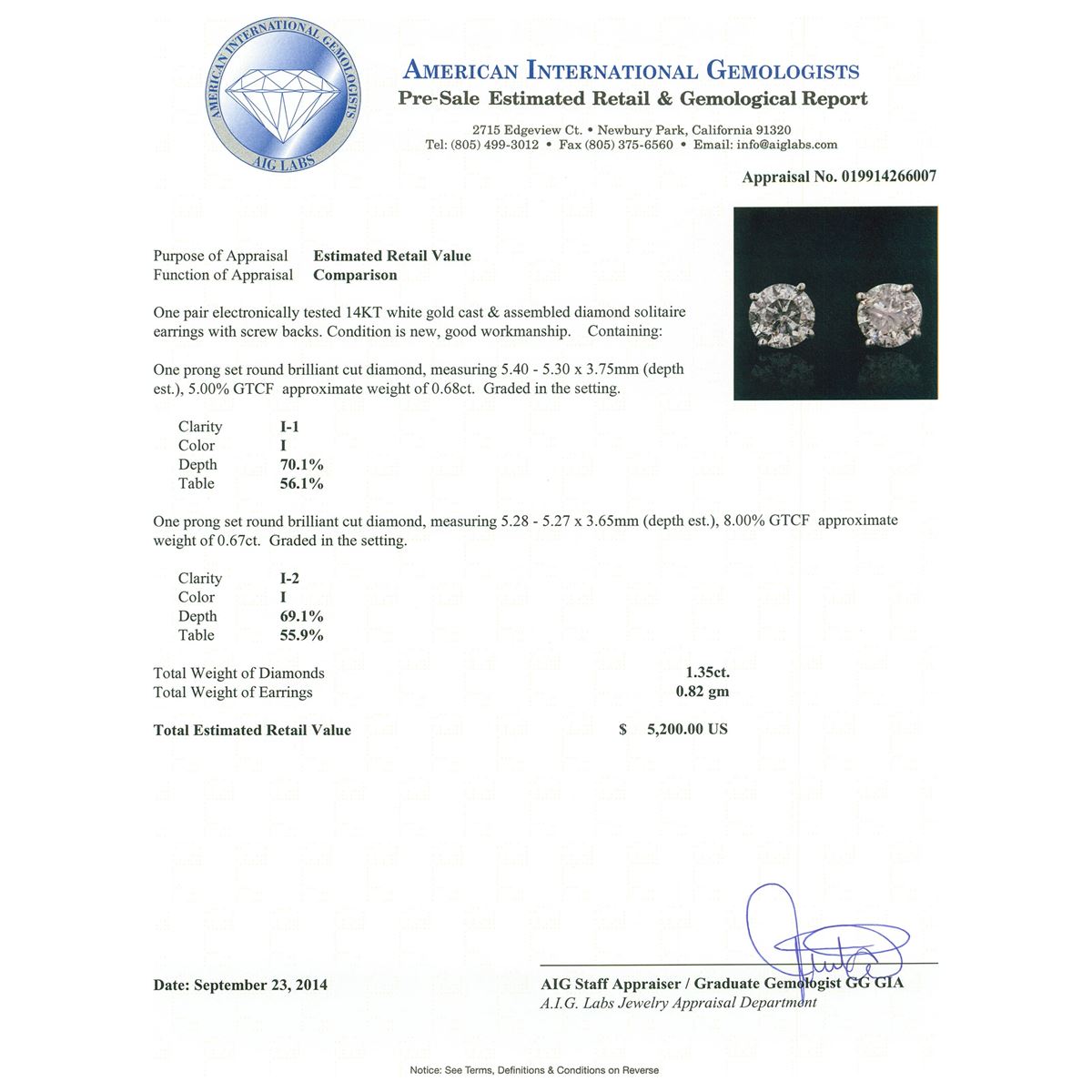 One pair electronically tested 14KT white gold cast & assembled diamond solitaire earrings with screw backs. Condition is new, good workmanship. Containing: One prong set round brilliant cut diamond, measuring 5.40 - 5.30 x 3.75mm (depth est.), 5.00% GTCF approximate weight of 0.68ct. Graded in the setting. Clarity: I-1. Color: I. Depth 70.1%. Table 56.1%. One prong set round brilliant cut diamond, measuring 5.28 - 5.27 x 3.65mm (depth est.), 8.00% GTCF approximate weight of 0.67ct. Graded in the setting. Clarity: I-2. Color: I. Depth 69.1%. Table 55.9%. Total Weight of Diamonds 1.35ct. Total Weight of Earrings 0.82 grams. AIG Appraised at $5,200.00.