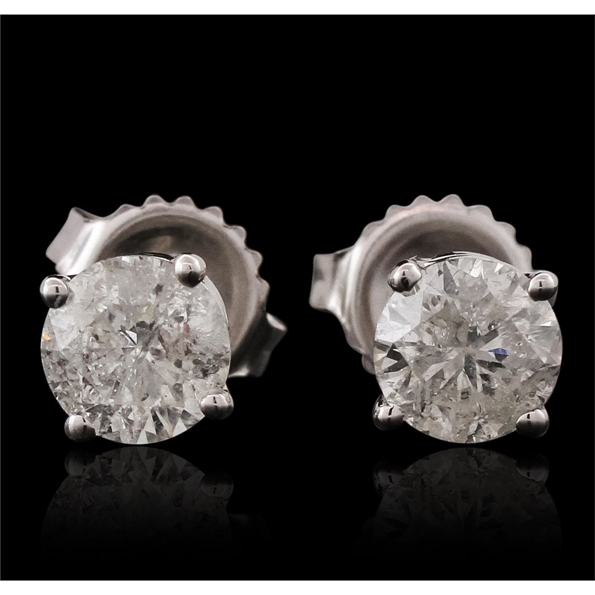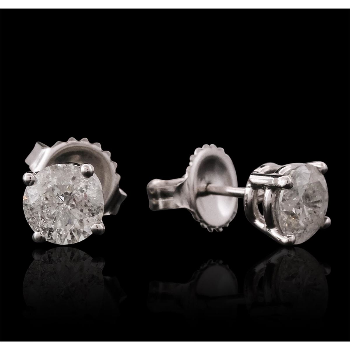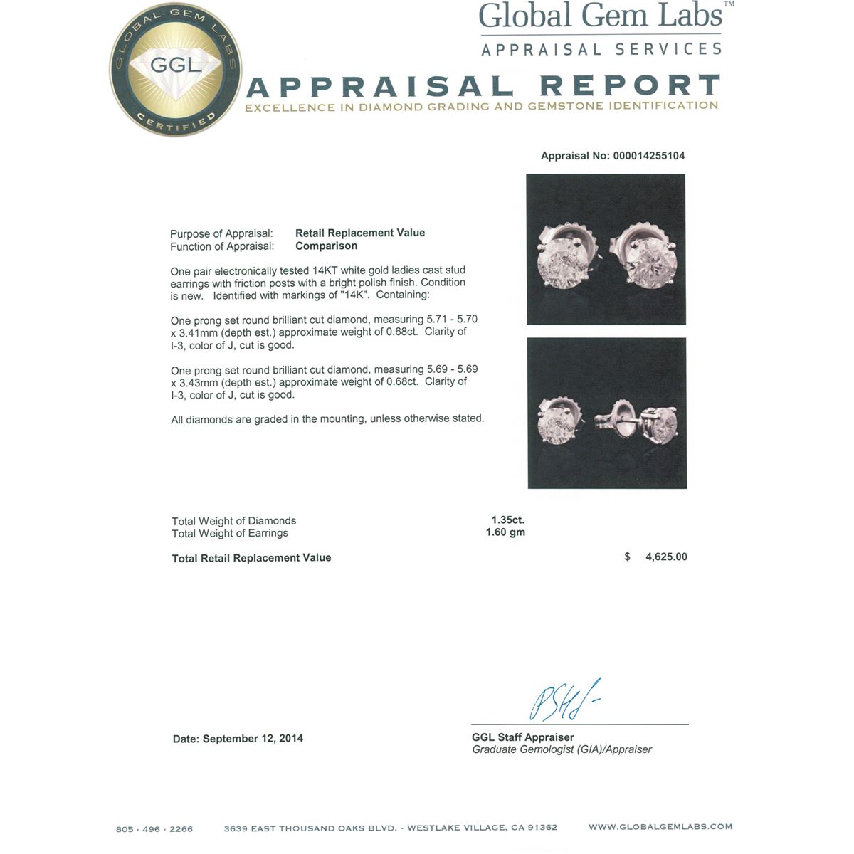 One pair electronically tested 14KT white gold ladies cast stud earrings with friction posts with a bright polish finish. Identified with markings of "14K". Condition is new. Containing: One prong set round brilliant cut diamond, measuring 5.71 - 5.70 x 3.41mm (depth est.) approximate weight of 0.68ct. Clarity: I-3. Color: J, Cut is Good. One prong set round brilliant cut diamond, measuring 5.69 - 5.69 x 3.43mm (depth est.) approximate weight of 0.68ct. Clarity: I-3. Color: J, Cut is Good. All diamonds are graded in the mounting, unless otherwise stated total weight of Diamonds 1.35ct. Total Weight of Earrings 1.60 grams. GGL Appraised at $4,625.00.