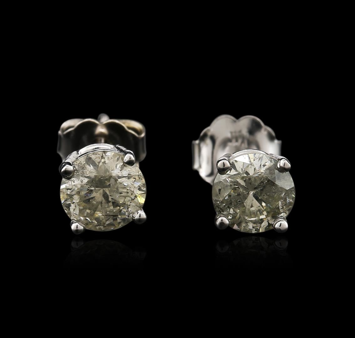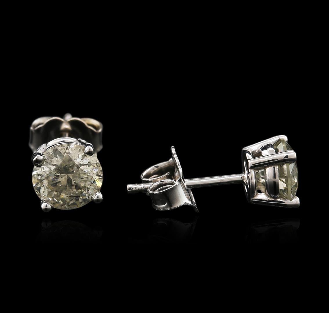 One pair electronically tested 14KT white gold ladies cast diamond stud earrings with friction posts with a bright polish finish. Identified with markings of "14K". Condition is new. Containing: Two prong set round brilliant cut diamonds, measuring 5.70 - 5.70 x 3.44mm (depth est.) approximate total weight of 2 Stones = 1.36ct. Clarity: I-3 to I-3. Color: K, Cut is Good. Diamonds are graded in the mounting, unless otherwise stated. Total Weight of Diamonds 1.36ct. Total Weight of Stud Earrings 1.10 grams. GGL Appraised at $1,555.00.