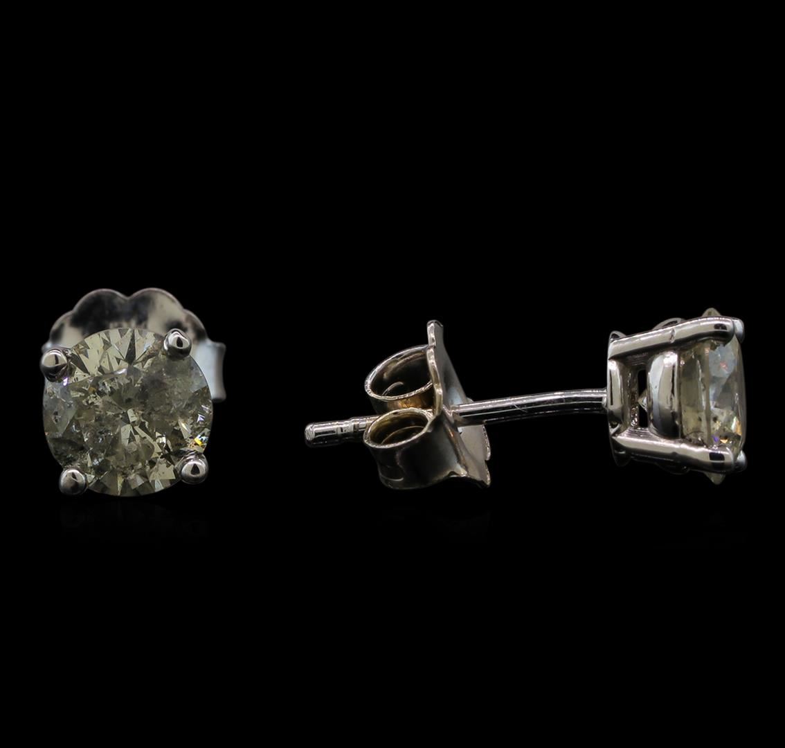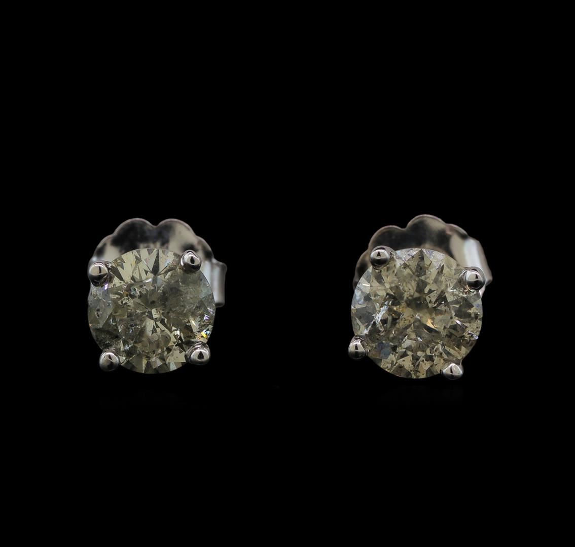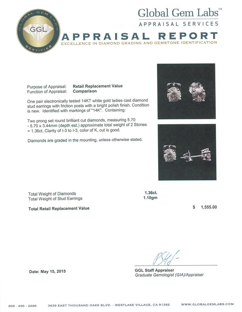 One pair electronically tested 14KT white gold ladies cast diamond stud earrings with friction posts with a bright polish finish. Identified with markings of "14K". Condition is new. Containing: Two prong set round brilliant cut diamonds, measuring 5.70 - 5.70 x 3.44mm (depth est.) approximate total weight of 2 Stones = 1.36ct. Clarity: I-3 to I-3. Color: K, Cut is Good. Diamonds are graded in the mounting, unless otherwise stated. Total Weight of Diamonds 1.36ct. Total Weight of Stud Earrings 1.10 grams. GGL Appraised at $1,555.00.