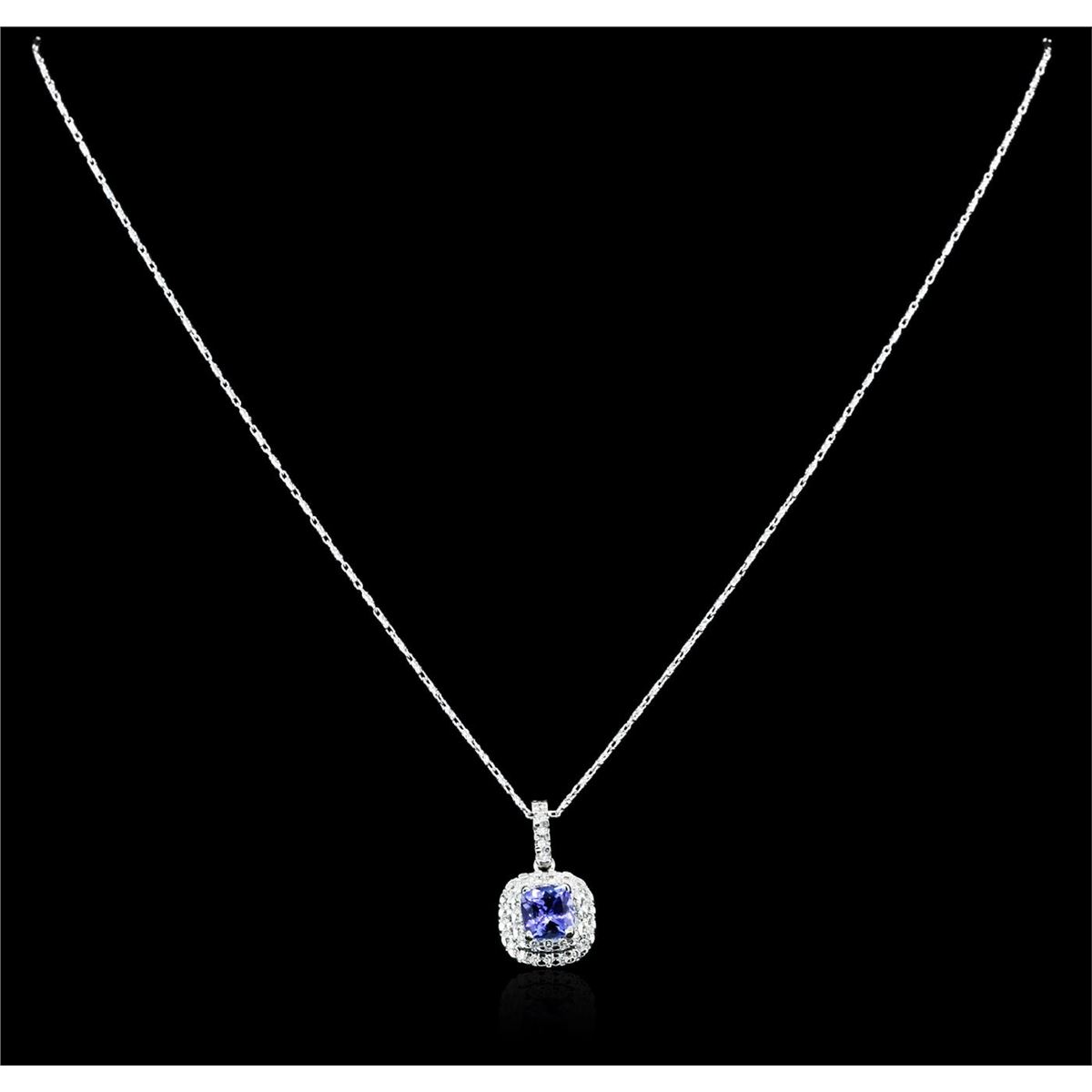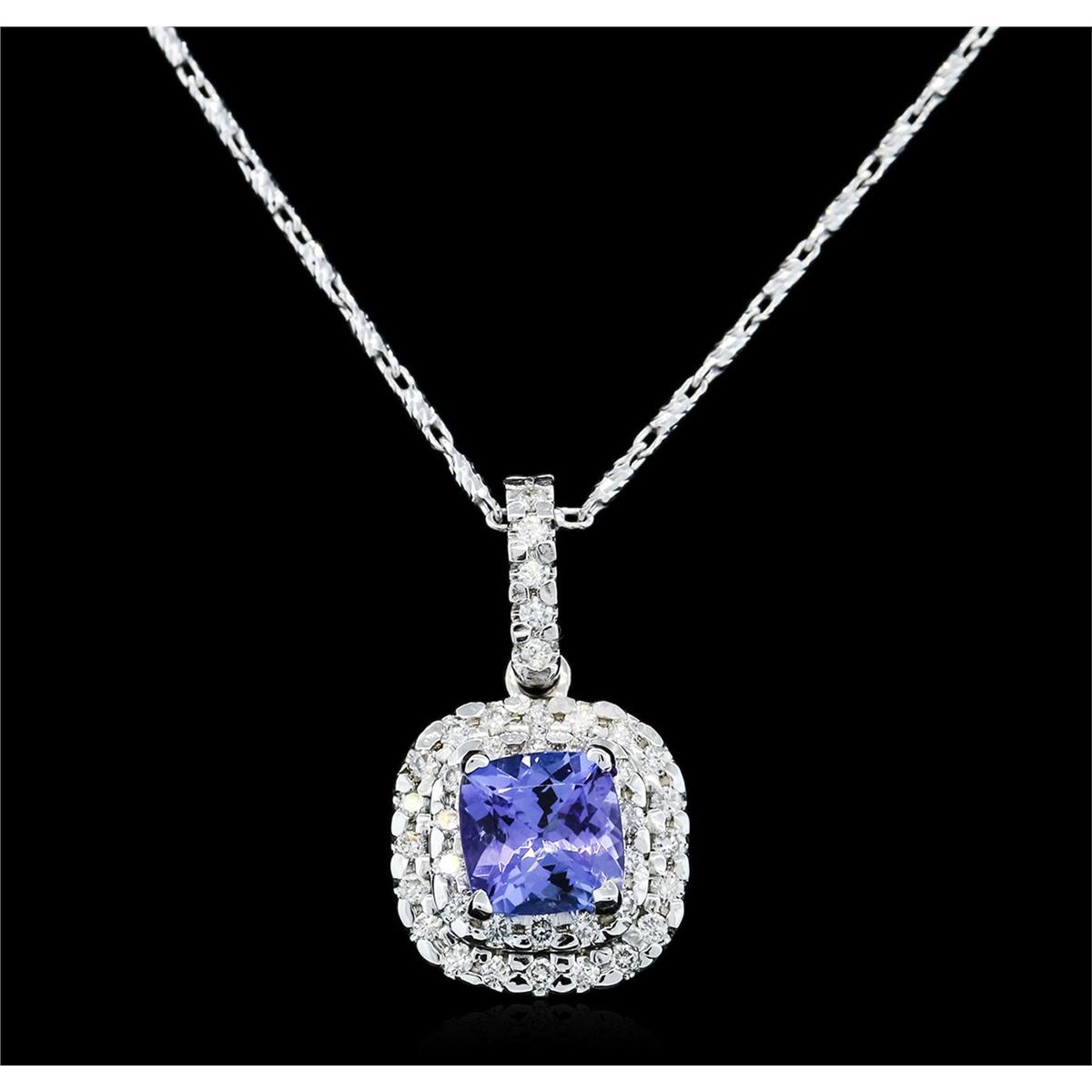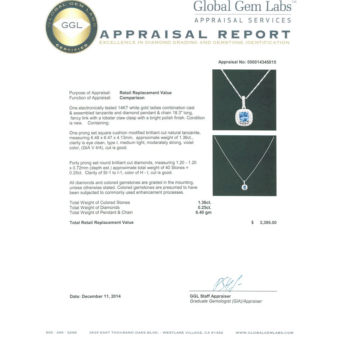 One electronically tested 14KT white gold ladies combination cast & assembled tanzanite and diamond pendant & chain 18.3" long, fancy link with a lobster claw clasp with a bright polish finish. Condition is new. Containing: One prong set square cushion modified brilliant cut natural tanzanite, measuring 6.48 x 6.47 x 4.13mm, approximate weight of 1.36ct., clarity is eye clean, type I, medium light, moderately strong, violet color, (GIA V 4/4), cut is good. Forty prong set round brilliant cut diamonds, measuring 1.20 - 1.20 x 0.72mm (depth est.) approximate total weight of 40 Stones = 0.25ct. Clarity: SI-1 to I-1. Color: H - I, Cut is Good. All diamonds and colored gemstones are graded in the mounting, unless otherwise stated. Colored gemstones are presumed to have been subjected to commonly used enhancement processes. Total Weight of Colored Stones 1.36ct. Total Weight of Diamonds 0.25ct. Total Weight of Pendant & Chain 6.40 grams. GGL Appraised at $3,395.00.