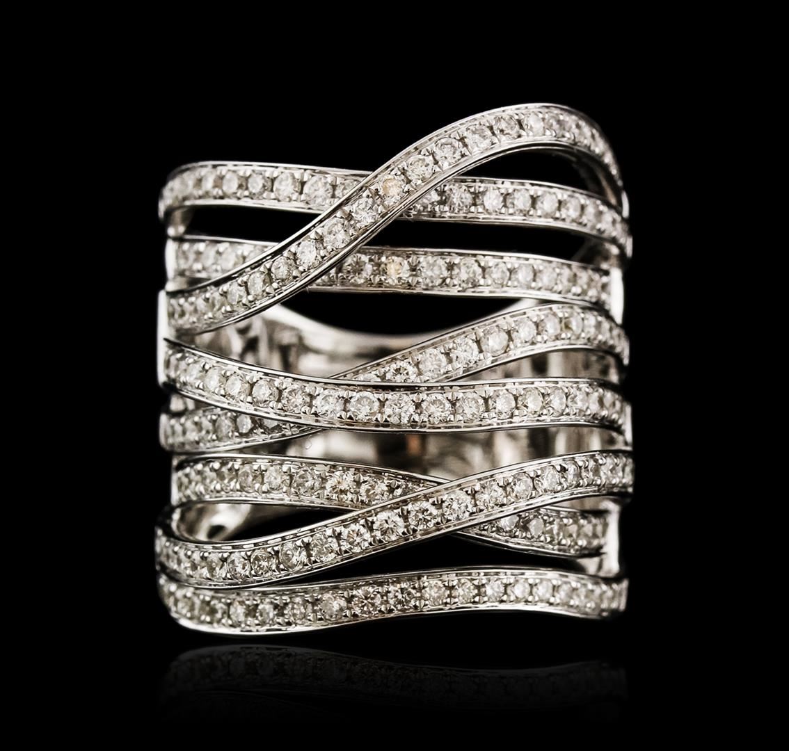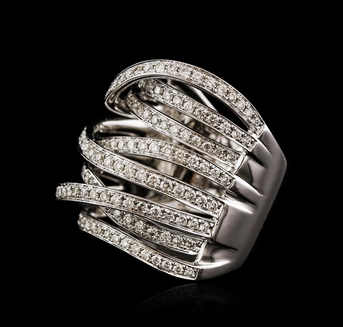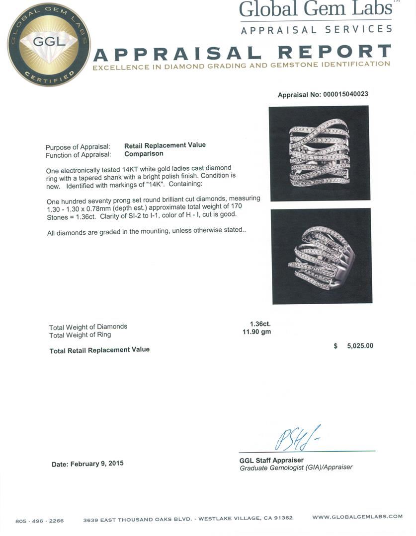 One electronically tested 14KT white gold ladies cast diamond ring with a tapered shank with a bright polish finish. Identified with markings of "14K". Condition is new. Containing: One Hundred Seventy prong set round brilliant cut diamonds, measuring 1.30 - 1.30 x 0.78mm (depth est.) approximate total weight of 170 Stones = 1.36ct. Clarity: SI-2 to I-1. Color: H - I, Cut is Good. All diamonds are graded in the mounting, unless otherwise stated.. Total Weight of Diamonds 1.36ct. Total Weight of Ring 11.90 grams. GGL Appraised at $5,025.00.