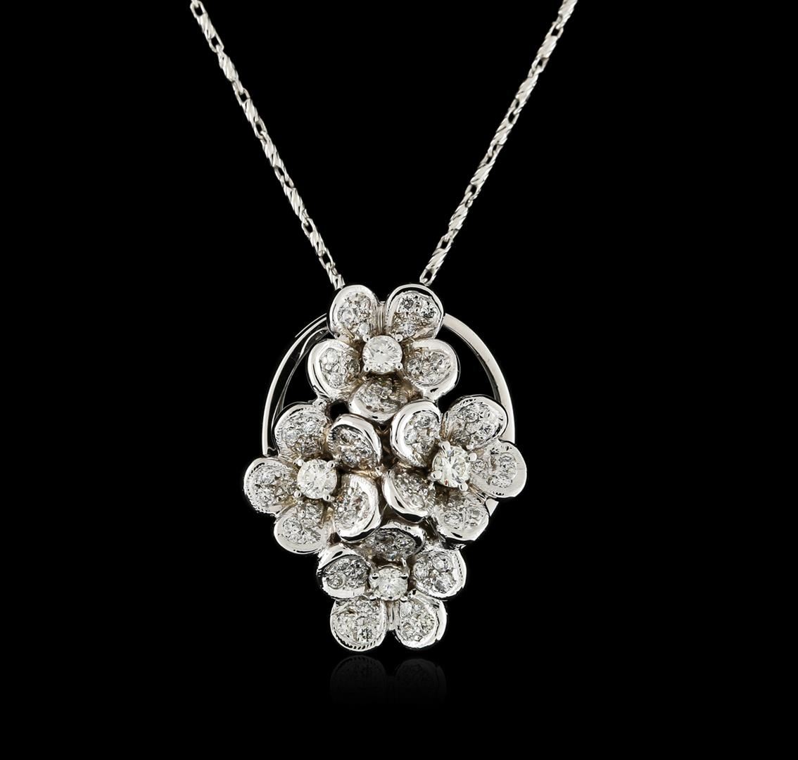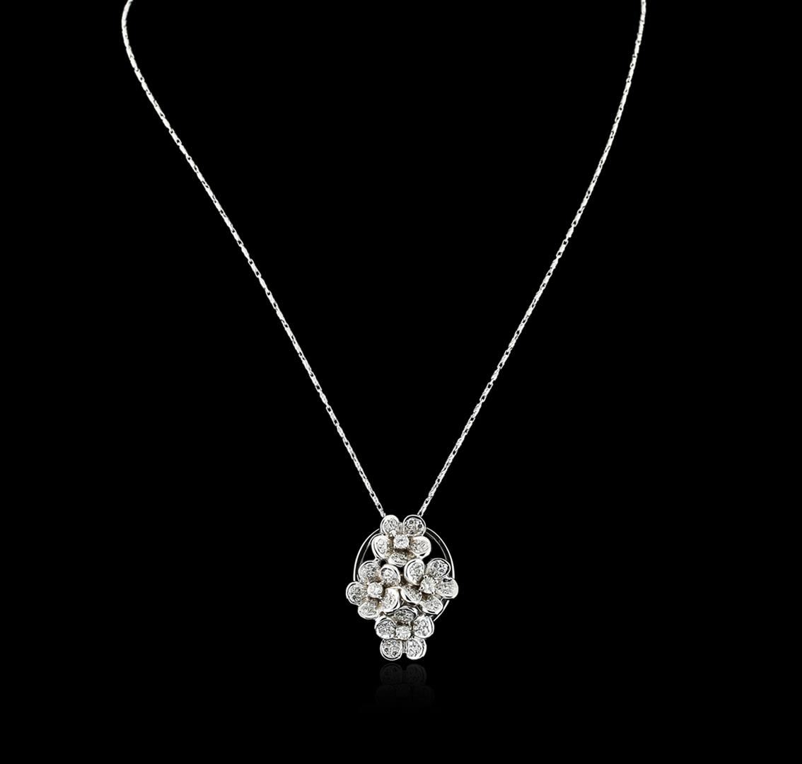 One electronically tested 14KT white gold ladies cast diamond pendant & chain 18.0" long, with a lobster claw clasp with a bright polish finish. Identified with markings of "585". Condition is new. Containing: Four prong set round brilliant cut diamonds, measuring 3.00 - 3.00 x 1.80mm (depth est.) approximate total weight of 4 Stones = 0.48ct. Clarity: SI-1 to SI-2. Color: H - I, Cut is Good. Sixty prong set round brilliant cut diamonds, measuring 1.30 - 1.30 x 0.78mm (depth est.) approximate total weight of 60 Stones = 0.89ct. Clarity: SI-2 to I-2. Color: H - I, Cut is Good. Diamonds are graded in the mounting, unless otherwise stated. Total Weight of Diamonds 1.37ct. Total Weight of Pendant & Chain 16.40 grams. GGL Appraised at $4,945.00.