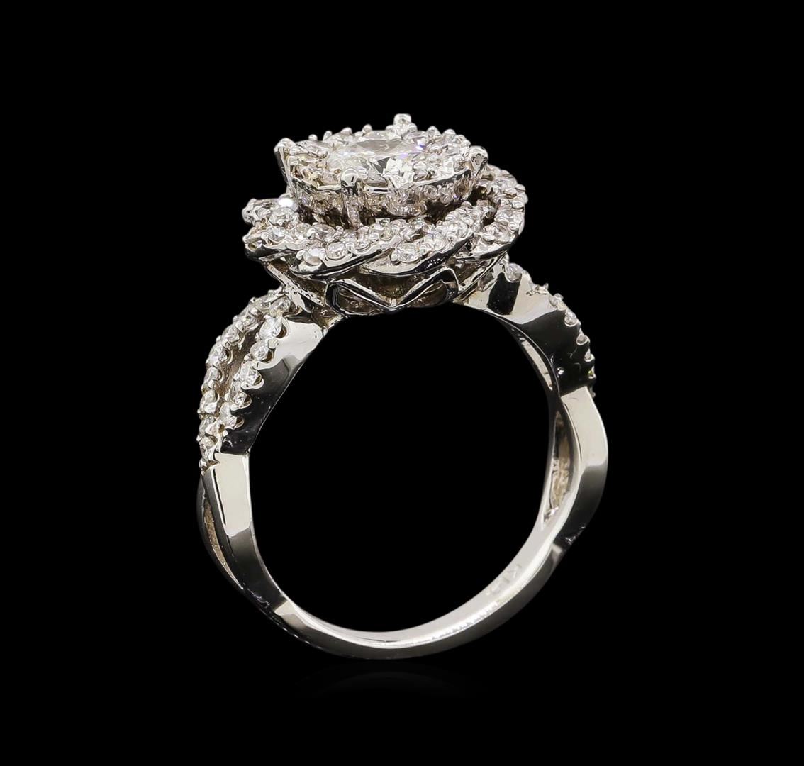 One electronically tested 14KT white gold ladies cast diamond engagement ring with a bright polish finish. Identified with markings of "k14". Condition is new. Containing: One prong set round brilliant cut diamond, measuring 5.50 - 5.50 x 3.30mm (depth est.) approximate weight of 0.61ct. Clarity: I-2. Color: J. Ninety-Five prong set round brilliant cut diamonds, measuring 1.30 - 1.30 x 0.78mm (depth est.) approximate total weight of 95 Stones = 0.76ct. Clarity: SI-2 to I-2. Color: I - J. All diamonds are graded in the mounting, unless otherwise stated. Total Weight of Diamonds 1.37ct. Total Weight of Engagement Ring 6.30 grams. GGL Appraised at $6,185.00.