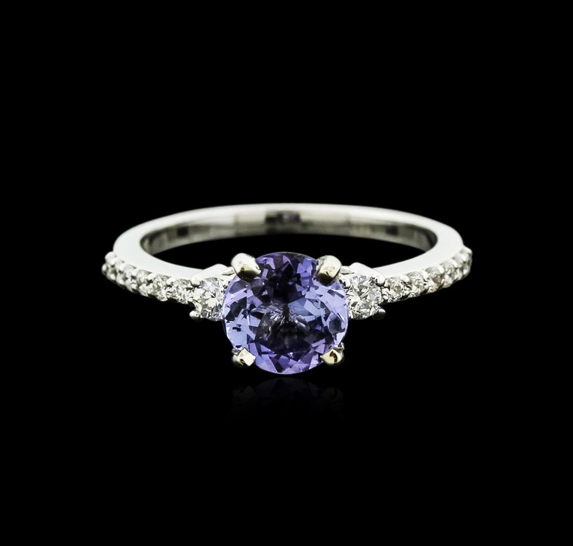 One electronically tested 14KT white gold ladies cast tanzanite and diamond ring with a bright and brushed finish. Identified with markings of "14K". Condition is new. Containing: One prong set round modified brilliant cut natural tanzanite, measuring 6.80 - 6.80 x 4.42 mm, approximate weight of 1.37ct., clarity is eye clean, type I, light, slightly grayish, violet color, (GIA V 3/2), cut is good. Fourteen prong set round brilliant cut diamonds, measuring 2.50 - 1.50 x 1.20mm (depth est.) approximate total weight of 14 Stones = 0.28ct. Clarity: SI-1 to SI-2. Color: I - J. Colored gemstones are presumed to have been subjected to commonly used enhancement processes. All diamonds and colored gemstones are graded in the mounting, unless otherwise stated. Total Weight of Colored Stones 1.37ct. Total Weight of Diamonds 0.28ct. Total Weight of Ring 2.70 grams. GGL Appraised at $1,940.00.
