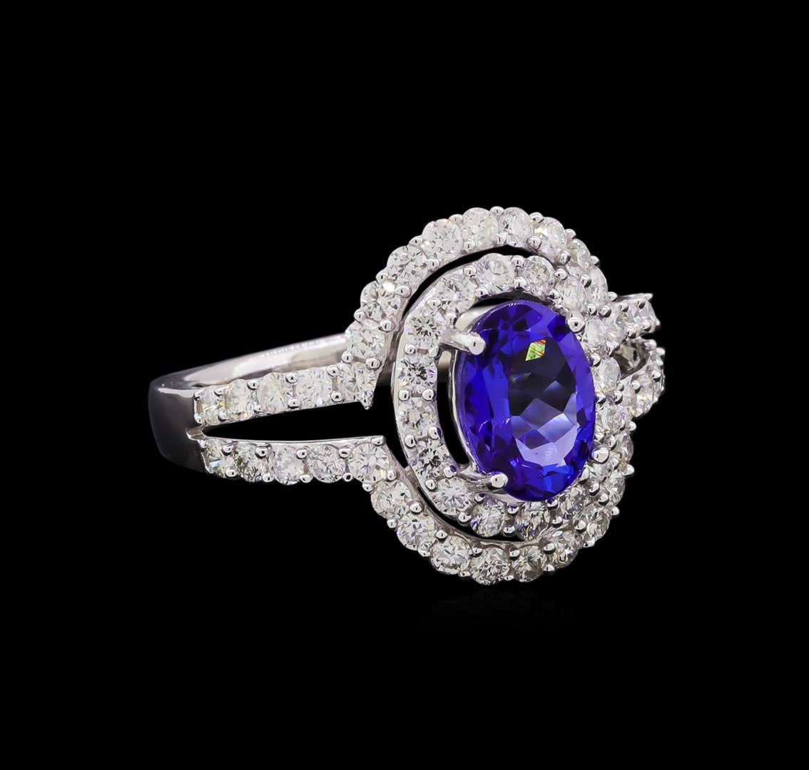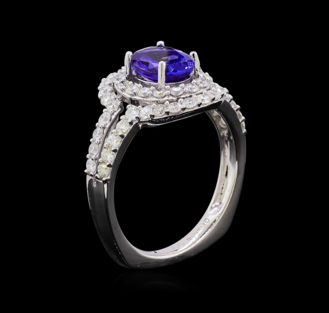 One electronically tested 14KT white gold ladies cast tanzanite and diamond ring with a bright polish finish. The featured tanzanite is set within two tiered diamond bezels supported by diamond set split shoulders, completed by a two and one-half millimeter wide band. Trademark is Orianne. Identified with markings of "14K". Condition is new, good workmanship. Containing: One prong set oval brilliant cut natural tanzanite, measuring 8.20 x 5.60 x 4.05mm, 6% bulge factor, approximate weight of 1.37ct., clarity is eye clean, type I, medium dark, very slightly grayish, violetish blue color, (GIA vB 6/3), cut is good. Transmitting light with no distortion, transparent. Graded in the setting. Tanzanite is a very rare gemstone that is only found in the country of Tanzania. Originally discovered in 1967. Tiffany & Company, named the stone Tanzanite. It is found in the Usumburu Mountains that border the Umba Valley of northern Tanzania. Tanzanite occurs in gray, brown, violet, blue, reddish-purple, & green. The gem is interesting because of its exceptional pleochroism. Rotated in different directions a tanzanite will exhibit multiple changes of color. Tanzanite has a low tolerance to ultrasonic cleaning, and should not be cleaned using this method. Fifty-Four prong set round brilliant cut diamonds, measuring 1.70 - 1.60 x 0.99mm (depth est.) approximate total weight of 54 Stones = 0.98ct. Graded in the setting. Clarity: SI-2 to I-1. Color: G - I. Total Weight of Colored Stones 1.37ct. Total Weight of Diamonds 0.98ct. Total Weight of Ring 4.36 grams. AIG Appraised.