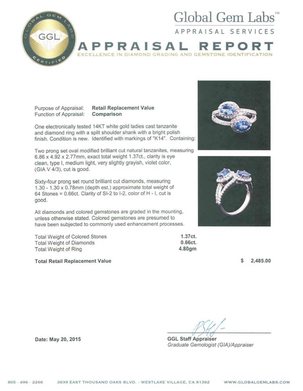 One electronically tested 14KT white gold ladies cast tanzanite and diamond ring with a split shoulder shank with a bright polish finish. Identified with markings of "K14". Condition is new. Containing: Two prong set oval modified brilliant cut natural tanzanites, measuring 6.86 x 4.92 x 2.77mm, exact total weight 1.37ct., clarity is eye clean, type I, medium light, very slightly grayish, violet color, (GIA V 4/3), cut is good. Sixty-Four prong set round brilliant cut diamonds, measuring 1.30 - 1.30 x 0.78mm (depth est.) approximate total weight of 64 Stones = 0.66ct. Clarity: SI-2 to I-2. Color: H - I, Cut is Good. All diamonds and colored gemstones are graded in the mounting, unless otherwise stated. Colored gemstones are presumed to have been subjected to commonly used enhancement processes. Total Weight of Colored Stones 1.37ct. Total Weight of Diamonds 0.66ct. Total Weight of Ring 4.80 grams. GGL Appraised.