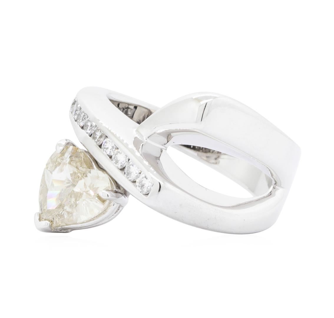One electronically tested 14KT white gold Ladies cast fashion ring with a split crossover shank with a bright polish finish. The featured Ladies ring has a shank measuring 2.97 millimeters wide. Identified with markings of '14K'. Condition is new, good workmanship. Containing: One prong set heart shaped cut diamond, measuring 7.52 x 7.10 x 3.35mm (depth est.) approximate weight of 1.13ct. Graded in the setting. Color U - V Clarity I-1 Cut Very Good Nine channel set round brilliant cut diamonds, measuring 2.00 - 1.90 x 1.21mm (depth est.) approximate total weight of 9 Stones = 0.25ct. Graded in the setting. Color G - H Clarity VS-2 to SI-1 Cut Good. Total Weight of Diamonds 1.38ct. Total Weight of Ring 8.00gm. GAS Appraised.