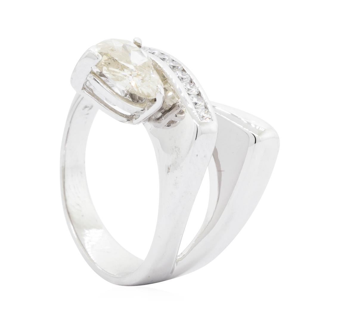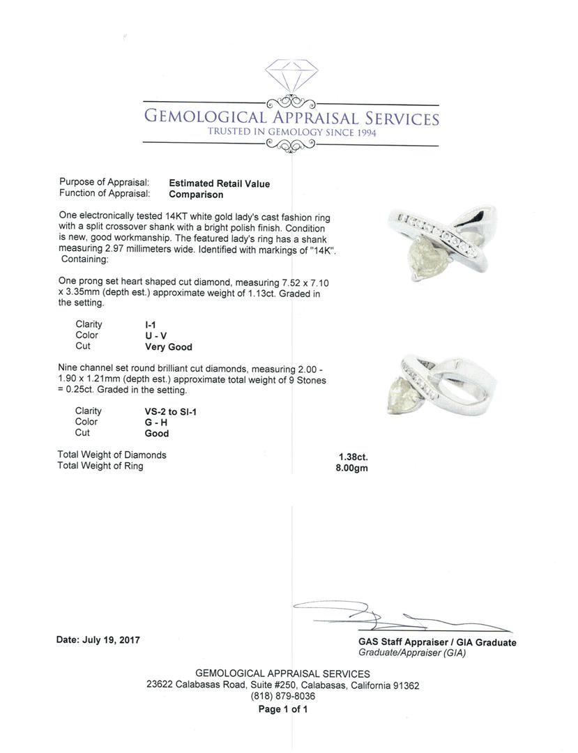 One electronically tested 14KT white gold Ladies cast fashion ring with a split crossover shank with a bright polish finish. The featured Ladies ring has a shank measuring 2.97 millimeters wide. Identified with markings of '14K'. Condition is new, good workmanship. Containing: One prong set heart shaped cut diamond, measuring 7.52 x 7.10 x 3.35mm (depth est.) approximate weight of 1.13ct. Graded in the setting. Color U - V Clarity I-1 Cut Very Good Nine channel set round brilliant cut diamonds, measuring 2.00 - 1.90 x 1.21mm (depth est.) approximate total weight of 9 Stones = 0.25ct. Graded in the setting. Color G - H Clarity VS-2 to SI-1 Cut Good. Total Weight of Diamonds 1.38ct. Total Weight of Ring 8.00gm. GAS Appraised.