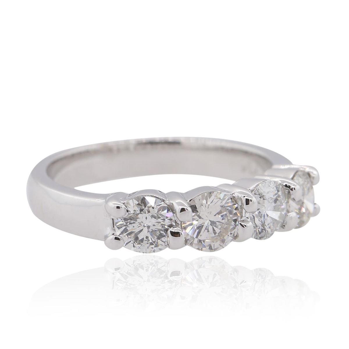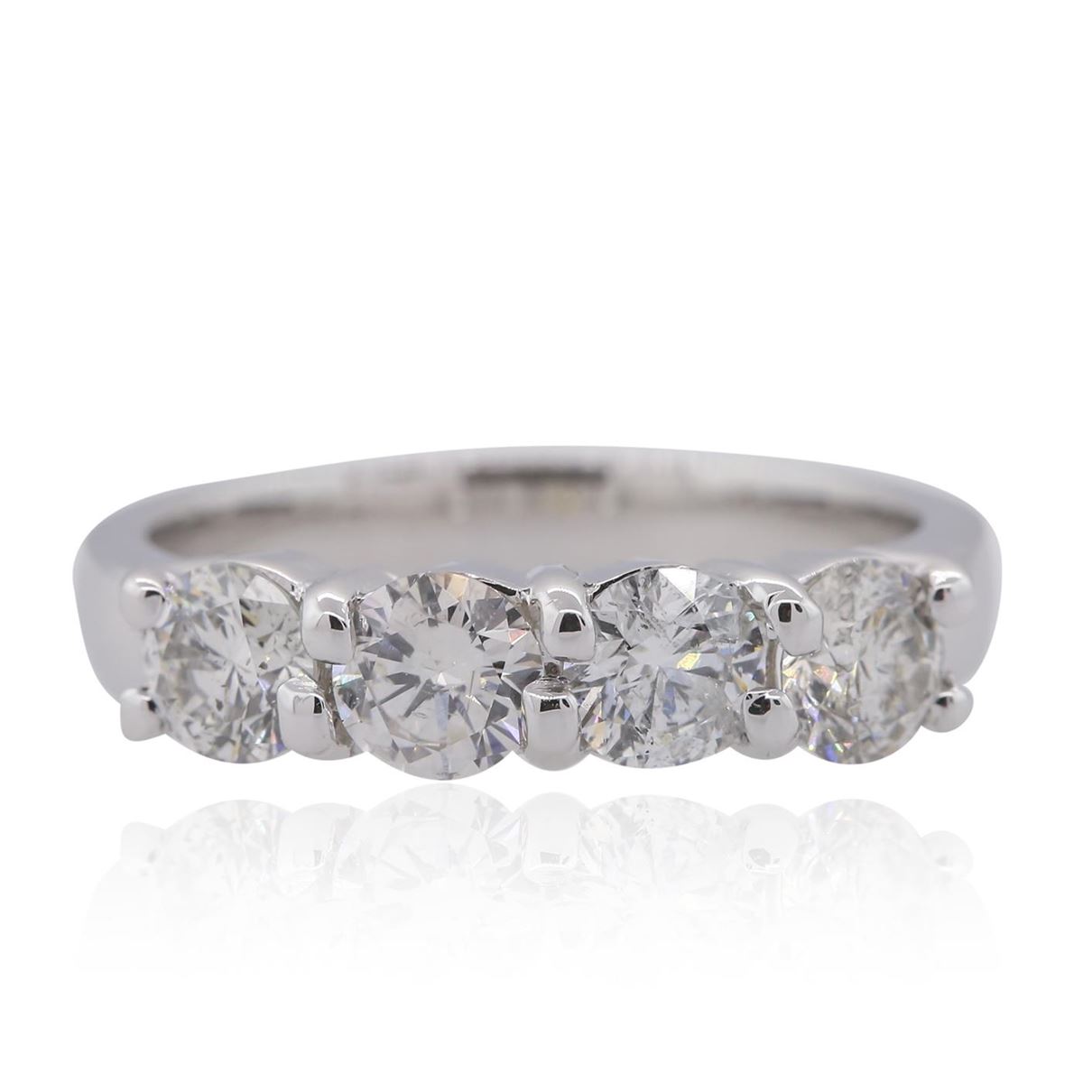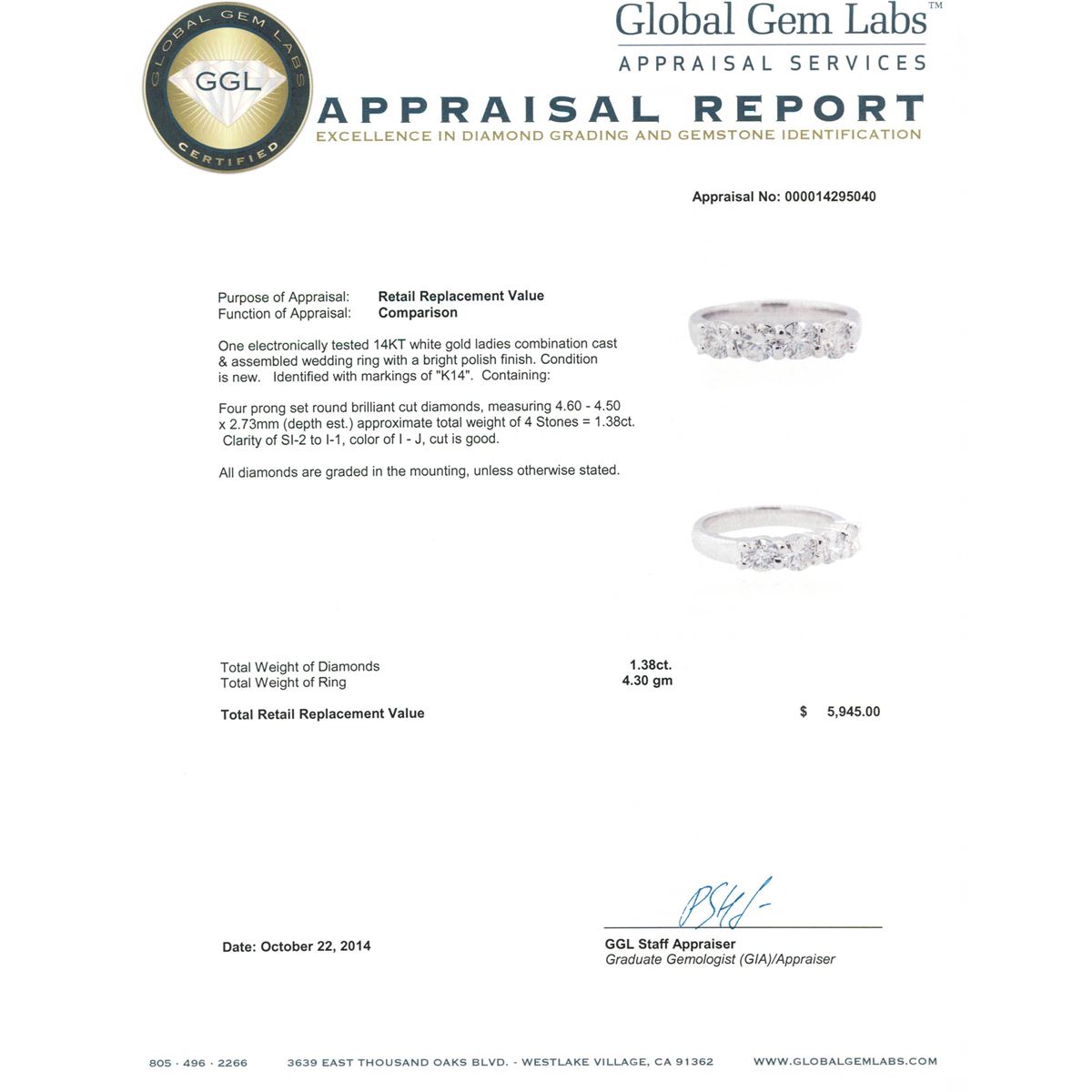 One electronically tested 14KT white gold ladies combination cast & assembled wedding ring with a bright polish finish. Identified with markings of "K14". Condition is new. Containing: Four prong set round brilliant cut diamonds, measuring 4.60 - 4.50 x 2.73mm (depth est.) approximate total weight of 4 Stones = 1.38ct. Clarity: SI-2 to I-1. Color: I - J, Cut is Good. All diamonds are graded in the mounting, unless otherwise stated. Total Weight of Diamonds 1.38ct. Total Weight of Ring 4.30 grams. GGL Appraised at $5,945.00.