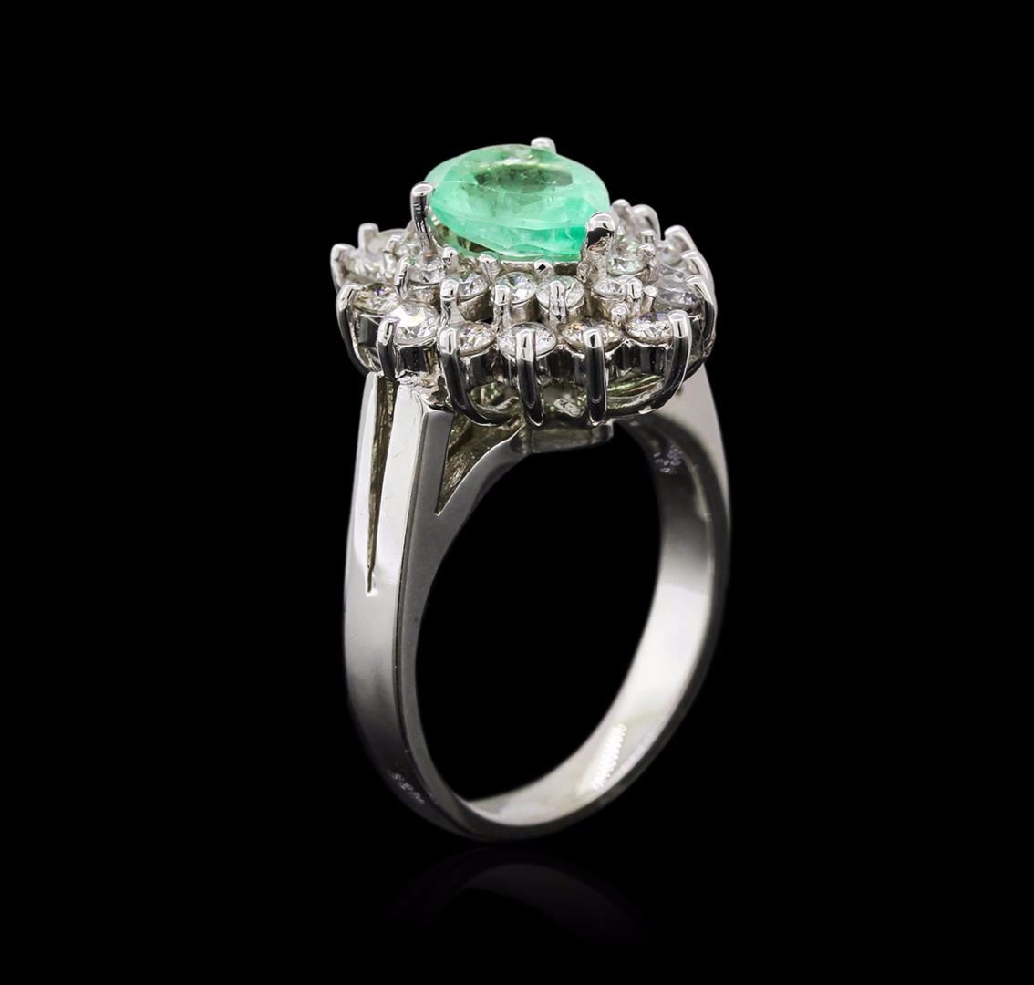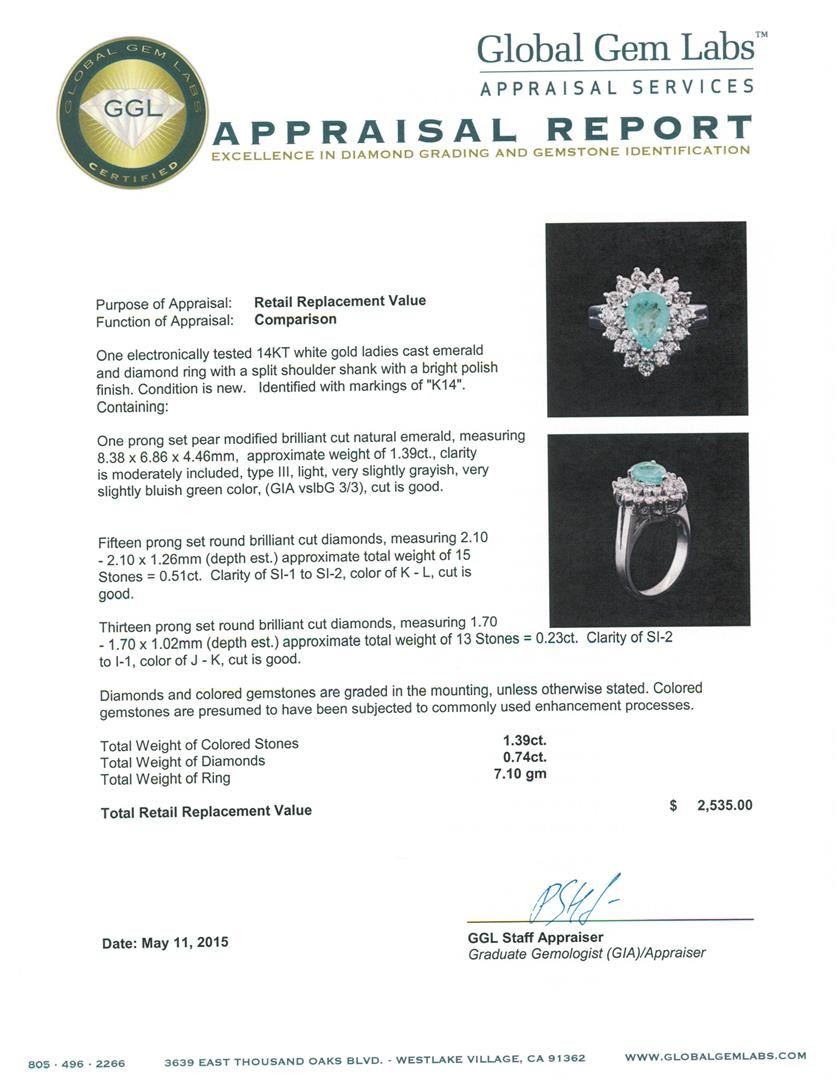 One electronically tested 14KT white gold ladies cast emerald and diamond ring with a split shoulder shank with a bright polish finish. Identified with markings of "K14". Condition is new. Containing: One prong set pear modified brilliant cut natural emerald, measuring 8.38 x 6.86 x 4.46mm, approximate weight of 1.39ct., clarity is moderately included, type III, light, very slightly grayish, very slightly bluish green color, (GIA vslbG 3/3), cut is good. Fifteen prong set round brilliant cut diamonds, measuring 2.10 - 2.10 x 1.26mm (depth est.) approximate total weight of 15 Stones = 0.51ct. Clarity: SI-1 to SI-2. Color: K - L, Cut is Good. Thirteen prong set round brilliant cut diamonds, measuring 1.70 - 1.70 x 1.02mm (depth est.) approximate total weight of 13 Stones = 0.23ct. Clarity: SI-2 to I-1. Color: J - K, Cut is Good. Diamonds and colored gemstones are graded in the mounting, unless otherwise stated. Colored gemstones are presumed to have been subjected to commonly used enhancement processes. Total Weight of Colored Stones 1.39ct. Total Weight of Diamonds 0.74ct. Total Weight of Ring 7.10 grams. GGL Appraised at $2,535.00.