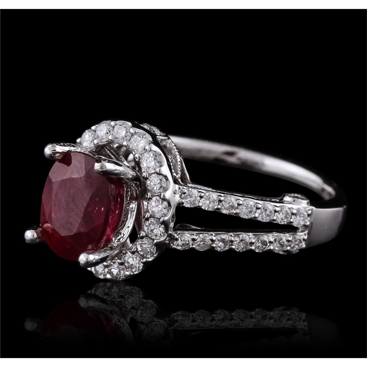 One electronically tested 14KT white gold Ladies cast ring with a bright polish finish. Condition is new. Identified with markings of "14K". Containing: One prong set oval modified brilliant cut natural ruby, measuring 7.90 x 6.20 x 3.50mm, approximate weight of 1.39ct., clarity is heavily included, type II, medium, moderately strong, strongly purplish red color, (GIA stpR 5/4), cut is good. Forty-Eight prong set round brilliant cut diamonds, measuring 1.30 - 1.30 x 0.78mm (depth est.) approximate. Total Weight of 48 Stones = 0.38ct. Clarity: I-1 to I-2. Color: I - J, Cut is Good. Colored gemstones are presumed to have been subjected to commonly used enhancement processes. All diamonds and colored gemstones are graded in the mounting, unless otherwise stated. Total Weight of Colored Stones 1.39ct. Total Weight of Diamonds 0.38ct. Total Weight of Ring 4.20 grams. GGL Appraised at $3,225.00.